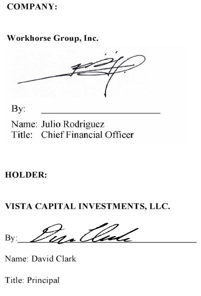 FOR VALUE RECEIVED, Workhorse Group, Inc., a Nevada corporation with a par value of $0.001 per common share (“Par Value”) (the "Company"), hereby promises to pay to the order of Vista Capital Investments, LLC or registered assigns (the "Holder") the amount set out above as the Original Principal Amount (as reduced pursuant to the terms hereof pursuant to redemption, conversion or otherwise, the "Principal") when due, whether upon the Maturity Date (as defined below), acceleration, redemption or otherwise (in each case in accordance with the terms hereof) and to pay interest ("Interest") on any outstanding Principal at the applicable Interest Rate from the date set out above as the Issuance Date (the "Issuance Date") until the same becomes due and payable, upon the Maturity Date or acceleration, conversion, redemption or otherwise (in each case in accordance with the terms hereof).