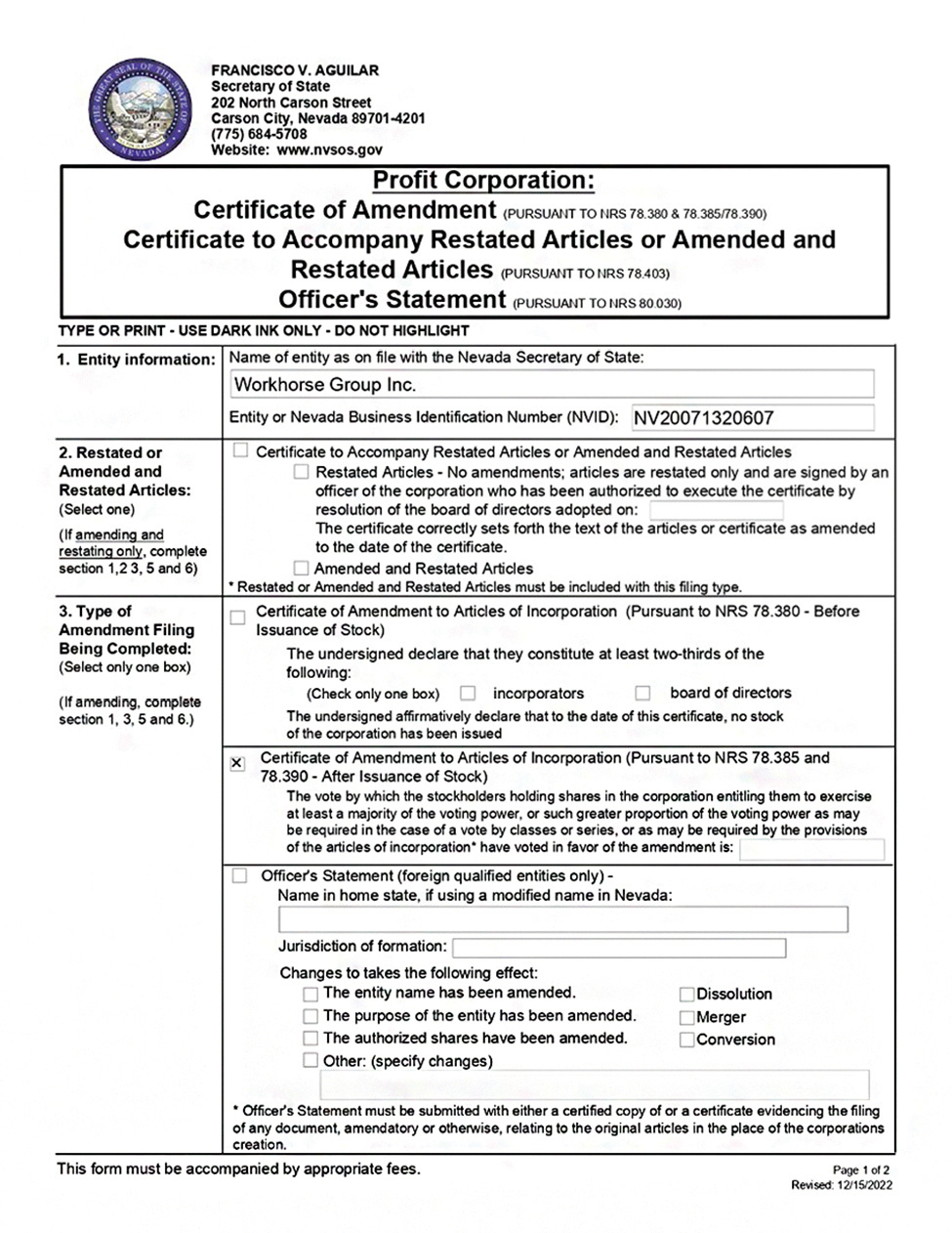 On July 7, 2023, our Board of Directors (the “Board”) approved an amendment to our Articles of Incorporation to increase the number of authorized shares of common stock to 450 million shares (the “Amendment”). Under the terms of our Certificate of Amendment to Articles of Incorporation and Nevada law, the Amendment must be approved by the holders of a majority of the outstanding shares of common stock. A copy of the Amendment, which is in the form of a Certificate of Amendment to Articles of Incorporation, is attached to this Proxy Statement as Appendix A. The Amendment makes no other changes to our Articles of Incorporation.