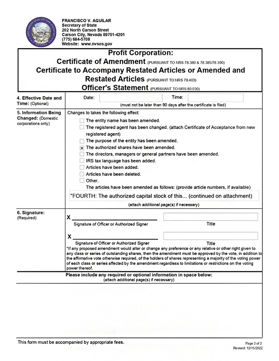 Pursuant to NRS 78.385 and NRS 78.390, and any successor statutory provisions, the Board of Directors is authorized to adopt a resolution to increase decrease, add, or remove or otherwise alter any current or additional classes or series of this Corporations’ capital stock by a board resolution amending these Articles, in the Board or Directors’ sole discretion for increases or decreased of any class or series of authorized stock where applicable pursuant to NRS 78.207 and any successor statutory provision, or otherwise subject to the approval of the holders of at least a majority or shares having voting rights, either in a special meeting or the next annual meeting of shareholders. Notwithstanding the foregoing, where any shares of any class or series would be materially and adversely affected by such change, shareholder approval by the holders of at least a majority of such adversely affected shares must also be obtained before filing an amendment with the Office of the Secretary of State of Nevada. The capital stock of this Corporation shall be non-accessible and shall not be subject to assessment to pay the debts of the Corporation.”