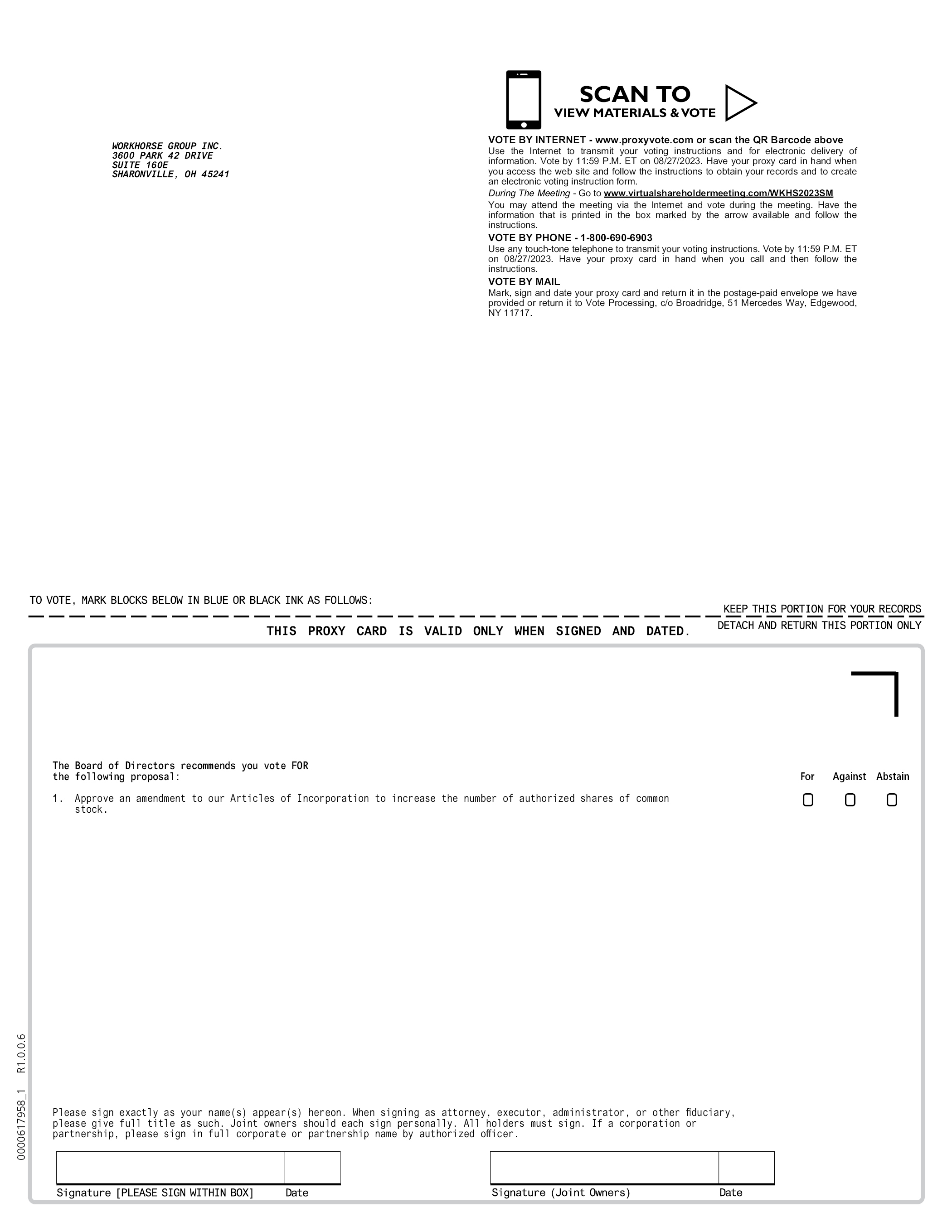 WORKHORSE GROUP INC. 3600 PARK 42 DRIVE SUITE 160E SHARONVILLE, OH 45241 SCAN TO VIEW MATERIALS & VOTE VOTE BY INTERNET - www.proxyvote.com or scan the QR Barcode above Use the Internet to transmit your voting instructions and for electronic delivery of information. Vote by 11:59 P.M. ET on 08/27/2023. Have your proxy card in hand when you access the web site and follow the instructions to obtain your records and to create an electronic voting instruction form. During The Meeting - Go to www.virtualshareholdermeeting.com/WKHS2023SM You may attend the meeting via the Internet and vote during the meeting. Have the information that is printed in the box marked by the arrow available and follow the instructions. VOTE BY PHONE - 1-800-690-6903 Use any touch-tone telephone to transmit your voting instructions. Vote by 11:59 P.M. ET on 08/27/2023. Have your proxy card in hand when you call and then follow the instructions. VOTE BY MAIL Mark, sign and date your proxy card and return it in the postage-paid envelope we have provided or return it to Vote Processing, c/o Broadridge, 51 Mercedes Way, Edgewood, NY 11717. TO VOTE, MARK BLOCKS BELOW IN BLUE OR BLACK INK AS FOLLOWS: KEEP THIS PORTION FOR YOUR RECORDS THIS PROXY CARD IS VALID ONLY WHEN SIGNED AND DATED. DETACH AND RETURN THIS PORTION ONLY The Board of Directors recommends you vote FOR the following proposal: 1. Approve an amendment to our Articles of Incorporation to increase the number of authorized shares of common stock. For Against Abstain Please sign exactly as your name(s) appear(s) hereon. When signing as attorney, executor, administrator, or other fiduciary, please give full title as such. Joint owners should each sign personally. All holders must sign. If a corporation or partnership, please sign in full corporate or partnership name by authorized officer. Signature [PLEASE SIGN WITHIN BOX] Date Signature (Joint Owners) Date 0000617958_1 R1.0.0.6