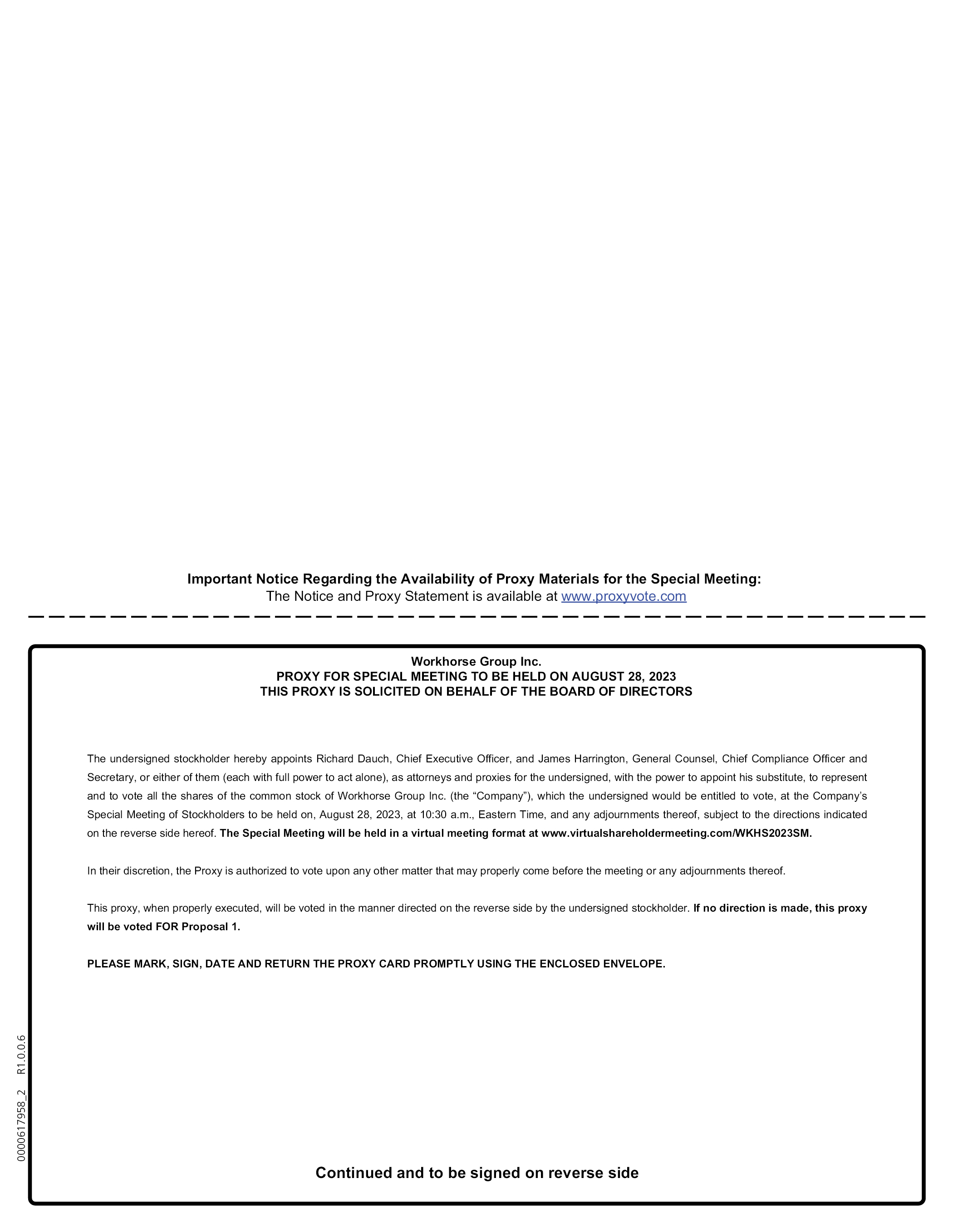 Important Notice Regarding the Availability of Proxy Materials for the Special Meeting: The Notice and Proxy Statement is available at www.proxyvote.com Workhorse Group Inc. PROXY FOR SPECIAL MEETING TO BE HELD ON AUGUST 28, 2023 THIS PROXY IS SOLICITED ON BEHALF OF THE BOARD OF DIRECTORS The undersigned stockholder hereby appoints Richard Dauch, Chief Executive Officer, and James Harrington, General Counsel, Chief Compliance Officer and Secretary, or either of them (each with full power to act alone), as attorneys and proxies for the undersigned, with the power to appoint his substitute, to represent and to vote all the shares of the common stock of Workhorse Group Inc. (the “Company”), which the undersigned would be entitled to vote, at the Company’s Special Meeting of Stockholders to be held on, August 28, 2023, at 10:30 a.m., Eastern Time, and any adjournments thereof, subject to the directions indicated on the reverse side hereof. The Special Meeting will be held in a virtual meeting format at www.virtualshareholdermeeting.com/WKHS2023SM. In their discretion, the Proxy is authorized to vote upon any other matter that may properly come before the meeting or any adjournments thereof. This proxy, when properly executed, will be voted in the manner directed on the reverse side by the undersigned stockholder. If no direction is made, this proxy will be voted FOR Proposal 1. PLEASE MARK, SIGN, DATE AND RETURN THE PROXY CARD PROMPTLY USING THE ENCLOSED ENVELOPE. Continued and to be signed on reverse side