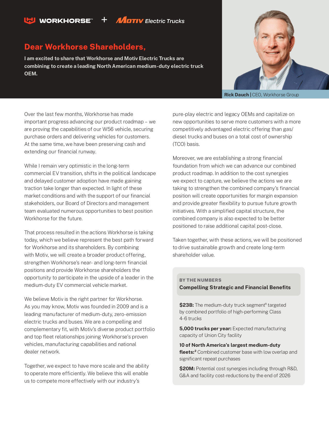 Over the last few months, Workhorse has made important progress advancing our product roadmap – we are proving the capabilities of our W56 vehicle, securing purchase orders and delivering vehicles for customers. At the same time, we have been preserving cash and extending our financial runway. While I remain very optimistic in the long - term commercial EV transition, shifts in the political landscape and delayed customer adoption have made gaining traction take longer than expected. In light of these market conditions and with the support of our financial stakeholders, our Board of Directors and management team evaluated numerous opportunities to best position Workhorse for the future. That process resulted in the actions Workhorse is taking today, which we believe represent the best path forward for Workhorse and its shareholders . By combining with Motiv, we will create a broader product offering, strengthen Workhorse’s near - and long - term financial positions and provide Workhorse shareholders the opportunity to participate in the upside of a leader in the medium - duty EV commercial vehicle market. We believe Motiv is the right partner for Workhorse. As you may know, Motiv was founded in 2009 and is a leading manufacturer of medium - duty, zero - emission electric trucks and buses. We are a compelling and complementary fit, with Motiv’s diverse product portfolio and top fleet relationships joining Workhorse’s proven vehicles, manufacturing capabilities and national dealer network. Together, we expect to have more scale and the ability to operate more efficiently . We believe this will enable us to compete more effectively with our industry’s pure - play electric and legacy OEMs and capitalize on new opportunities to serve more customers with a more competitively advantaged electric offering than gas/ diesel trucks and buses on a total cost of ownership (TCO) basis. Moreover, we are establishing a strong financial foundation from which we can advance our combined product roadmap. In addition to the cost synergies we expect to capture, we believe the actions we are taking to strengthen the combined company’s financial position will create opportunities for margin expansion and provide greater flexibility to pursue future growth initiatives. With a simplified capital structure, the combined company is also expected to be better positioned to raise additional capital post - close. Taken together, with these actions, we will be positioned to drive sustainable growth and create long - term shareholder value. Rick Dauch | CEO, Workhorse Group Dear Workhorse Shareholders, I am excited to share that Workhorse and Motiv Electric Trucks are combining to create a leading North American medium - duty electric truck OEM. BY THE NUMBERS Compelling Strategic and Financial Benefits $23B: The medium - duty truck segment 1 targeted by combined portfolio of high - performing Class 4 - 6 trucks 5,000 trucks per year: Expected manufacturing capacity of Union City facility 10 of North America’s largest medium - duty fleets: 2 Combined customer base with low overlap and significant repeat purchases $20M: Potential cost synergies including through R&D, G&A and facility cost - reductions by the end of 2026