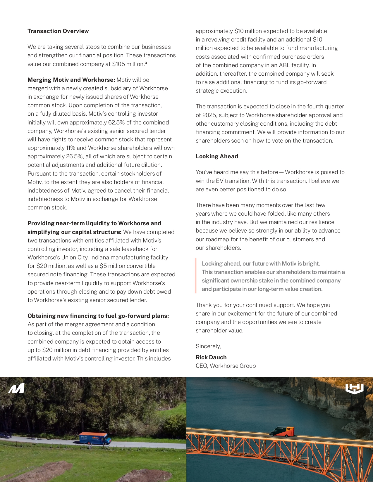Transaction Overview We are taking several steps to combine our businesses and strengthen our financial position. These transactions value our combined company at $105 million. 3 Merging Motiv and Workhorse: Motiv will be merged with a newly created subsidiary of Workhorse in exchange for newly issued shares of Workhorse common stock. Upon completion of the transaction, on a fully diluted basis, Motiv’s controlling investor initially will own approximately 62.5% of the combined company, Workhorse’s existing senior secured lender will have rights to receive common stock that represent approximately 11% and Workhorse shareholders will own approximately 26.5%, all of which are subject to certain potential adjustments and additional future dilution. Pursuant to the transaction, certain stockholders of Motiv, to the extent they are also holders of financial indebtedness of Motiv, agreed to cancel their financial indebtedness to Motiv in exchange for Workhorse common stock. Providing near - term liquidity to Workhorse and simplifying our capital structure: We have completed two transactions with entities affiliated with Motiv’s controlling investor, including a sale leaseback for Workhorse’s Union City, Indiana manufacturing facility for $20 million, as well as a $5 million convertible secured note financing. These transactions are expected to provide near - term liquidity to support Workhorse’s operations through closing and to pay down debt owed to Workhorse’s existing senior secured lender. Obtaining new financing to fuel go - forward plans: As part of the merger agreement and a condition to closing, at the completion of the transaction, the combined company is expected to obtain access to up to $20 million in debt financing provided by entities affiliated with Motiv’s controlling investor. This includes approximately $10 million expected to be available in a revolving credit facility and an additional $10 million expected to be available to fund manufacturing costs associated with confirmed purchase orders of the combined company in an ABL facility. In addition, thereafter, the combined company will seek to raise additional financing to fund its go - forward strategic execution. The transaction is expected to close in the fourth quarter of 2025, subject to Workhorse shareholder approval and other customary closing conditions, including the debt financing commitment. We will provide information to our shareholders soon on how to vote on the transaction. Looking Ahead You’ve heard me say this before — Workhorse is poised to win the EV transition. With this transaction, I believe we are even better positioned to do so. There have been many moments over the last few years where we could have folded, like many others in the industry have. But we maintained our resilience because we believe so strongly in our ability to advance our roadmap for the benefit of our customers and our shareholders. Looking ahead, our future with Motiv is bright. This transaction enables our shareholders to maintain a significant ownership stake in the combined company and participate in our long - term value creation. Thank you for your continued support. We hope you share in our excitement for the future of our combined company and the opportunities we see to create shareholder value. Sincerely, Rick Dauch CEO, Workhorse Group