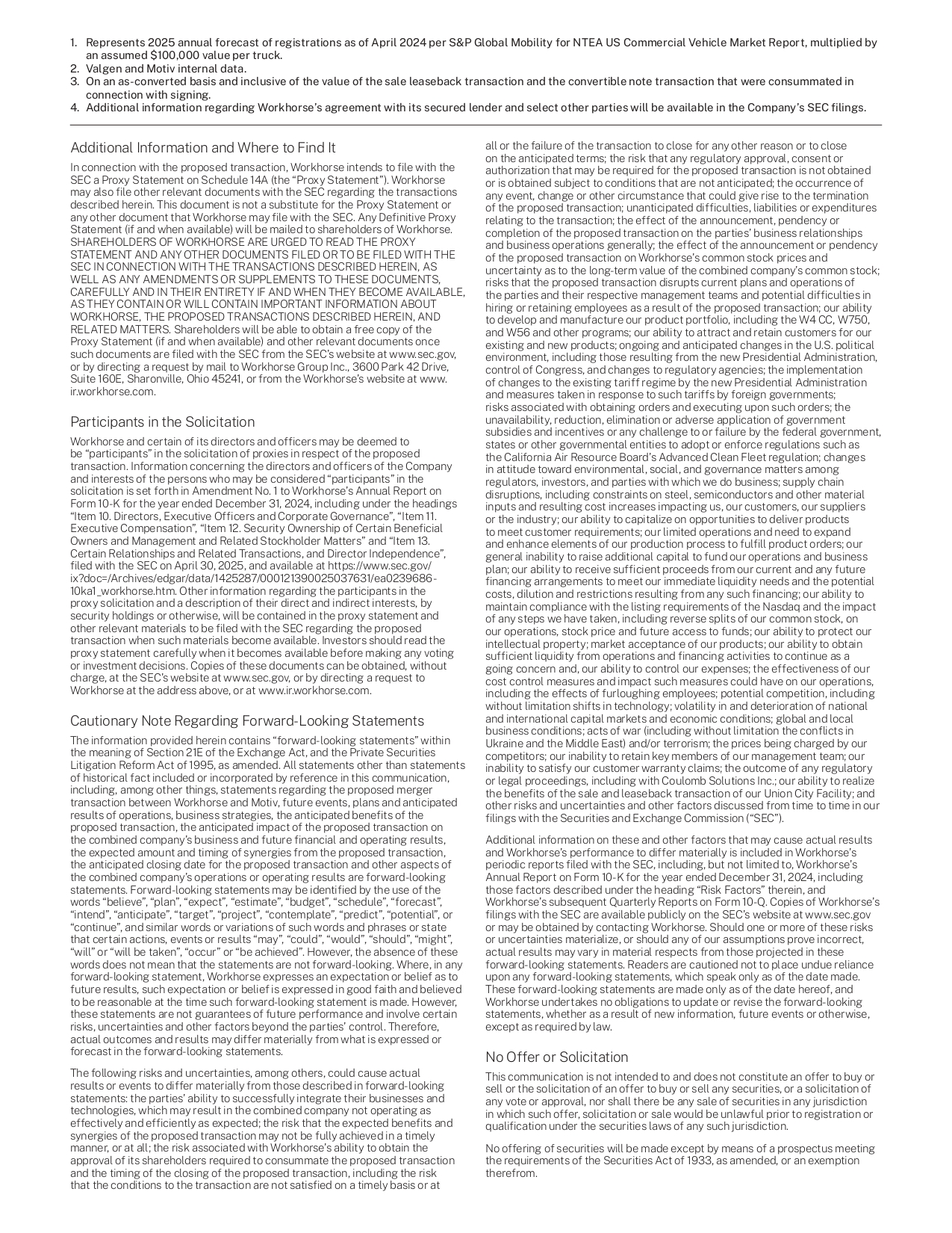 1. Represents 2025 annual forecast of registrations as of April 2024 per S&P Global Mobility for NTEA US Commercial Vehicle Market Report, multiplied by an assumed €100,000 value per truck. 2. Valgen and Motiv internal data. 3. On an as - converted basis and inclusive of the value of the sale leaseback transaction and the convertible note transaction that were consummated in connection with signing. 4. Additional information regarding Workhorse’s agreement with its secured lender and select other parties will be available in the Company’s SEC filings. Additional Information and Where to Find It In connection with the proposed transaction, Workhorse intends to file with the SEC a Proxy Statement on Schedule 14A (the “Proxy Statement”). Workhorse may also file other relevant documents with the SEC regarding the transactions described herein. This document is not a substitute for the Proxy Statement or any other document that Workhorse may file with the SEC. Any Definitive Proxy Statement (if and when available) will be mailed to shareholders of Workhorse. SHAREHOLDERS OF WORKHORSE ARE URGED TO READ THE PROXY STATEMENT AND ANY OTHER DOCUMENTS FILED OR TO BE FILED WITH THE SEC IN CONNECTION WITH THE TRANSACTIONS DESCRIBED HEREIN, AS WELL AS ANY AMENDMENTS OR SUPPLEMENTS TO THESE DOCUMENTS, CAREFULLY AND IN THEIR ENTIRETY IF AND WHEN THEY BECOME AVAILABLE, AS THEY CONTAIN OR WILL CONTAIN IMPORTANT INFORMATION ABOUT WORKHORSE, THE PROPOSED TRANSACTIONS DESCRIBED HEREIN, AND RELATED MATTERS. Shareholders will be able to obtain a free copy of the Proxy Statement (if and when available) and other relevant documents once such documents are filed with the SEC from the SEC’s website at www.sec.gov, or by directing a request by mail to Workhorse Group Inc., 3600 Park 42 Drive, Suite 160E, Sharonville, Ohio 45241, or from the Workhorse’s website at www. ir.workhorse.com. Participants in the Solicitation Workhorse and certain of its directors and officers may be deemed to be “participants” in the solicitation of proxies in respect of the proposed transaction. Information concerning the directors and officers of the Company and interests of the persons who may be considered “participants” in the solicitation is set forth in Amendment No. 1 to Workhorse’s Annual Report on Form 10 - K for the year ended December 31, 2024, including under the headings “Item 10. Directors, Executive Officers and Corporate Governance”, “Item 11. Executive Compensation”, “Item 12. Security Ownership of Certain Beneficial Owners and Management and Related Stockholder Matters” and “Item 13. Certain Relationships and Related Transactions, and Director Independence”, filed with the SEC on April 30, 2025, and available at https:// www.sec.gov/ ix?doc=/Archives/edgar/data/1425287/000121390025037631/ea0239686 - 10ka1_workhorse.htm. Other information regarding the participants in the proxy solicitation and a description of their direct and indirect interests, by security holdings or otherwise, will be contained in the proxy statement and other relevant materials to be filed with the SEC regarding the proposed transaction when such materials become available. Investors should read the proxy statement carefully when it becomes available before making any voting or investment decisions. Copies of these documents can be obtained, without charge, at the SEC’s website at www.sec.gov, or by directing a request to Workhorse at the address above, or at www.ir.workhorse.com. Cautionary Note Regarding Forward - Looking Statements The information provided herein contains “forward - looking statements” within the meaning of Section 21E of the Exchange Act, and the Private Securities Litigation Reform Act of 1995, as amended. All statements other than statements of historical fact included or incorporated by reference in this communication, including, among other things, statements regarding the proposed merger transaction between Workhorse and Motiv, future events, plans and anticipated results of operations, business strategies, the anticipated benefits of the proposed transaction, the anticipated impact of the proposed transaction on the combined company’s business and future financial and operating results, the expected amount and timing of synergies from the proposed transaction, the anticipated closing date for the proposed transaction and other aspects of the combined company’s operations or operating results are forward - looking statements. Forward - looking statements may be identified by the use of the words “believe”, “plan”, “expect”, “estimate”, “budget”, “schedule”, “forecast”, “intend”, “anticipate”, “target”, “project”, “contemplate”, “predict”, “potential”, or “continue”, and similar words or variations of such words and phrases or state that certain actions, events or results “may”, “could”, “would”, “should”, “might”, “will” or “will be taken”, “occur” or “be achieved”. However, the absence of these words does not mean that the statements are not forward - looking. Where, in any forward - looking statement, Workhorse expresses an expectation or belief as to future results, such expectation or belief is expressed in good faith and believed to be reasonable at the time such forward - looking statement is made. However, these statements are not guarantees of future performance and involve certain risks, uncertainties and other factors beyond the parties’ control. Therefore, actual outcomes and results may differ materially from what is expressed or forecast in the forward - looking statements. The following risks and uncertainties, among others, could cause actual results or events to differ materially from those described in forward - looking statements: the parties’ ability to successfully integrate their businesses and technologies, which may result in the combined company not ope