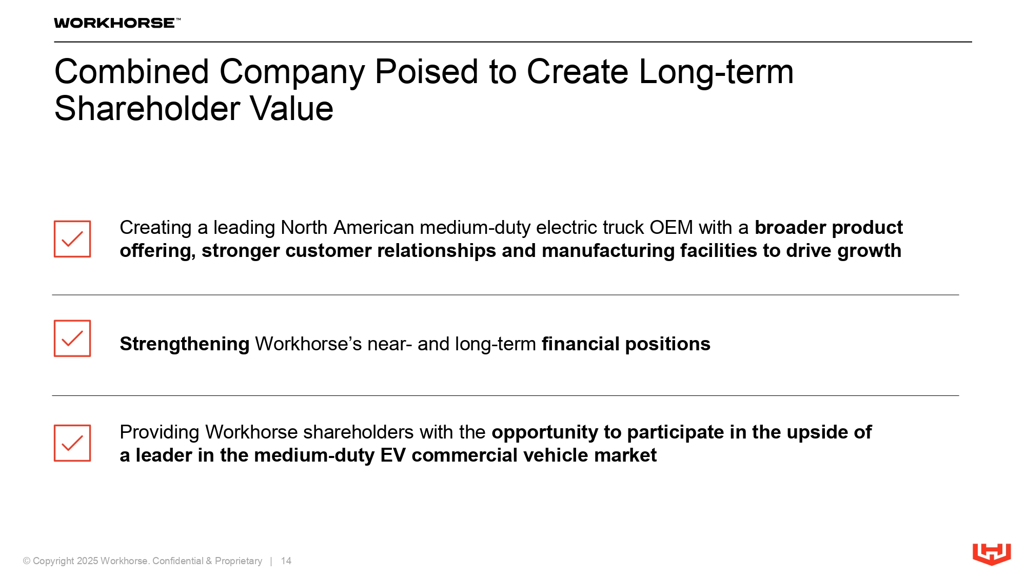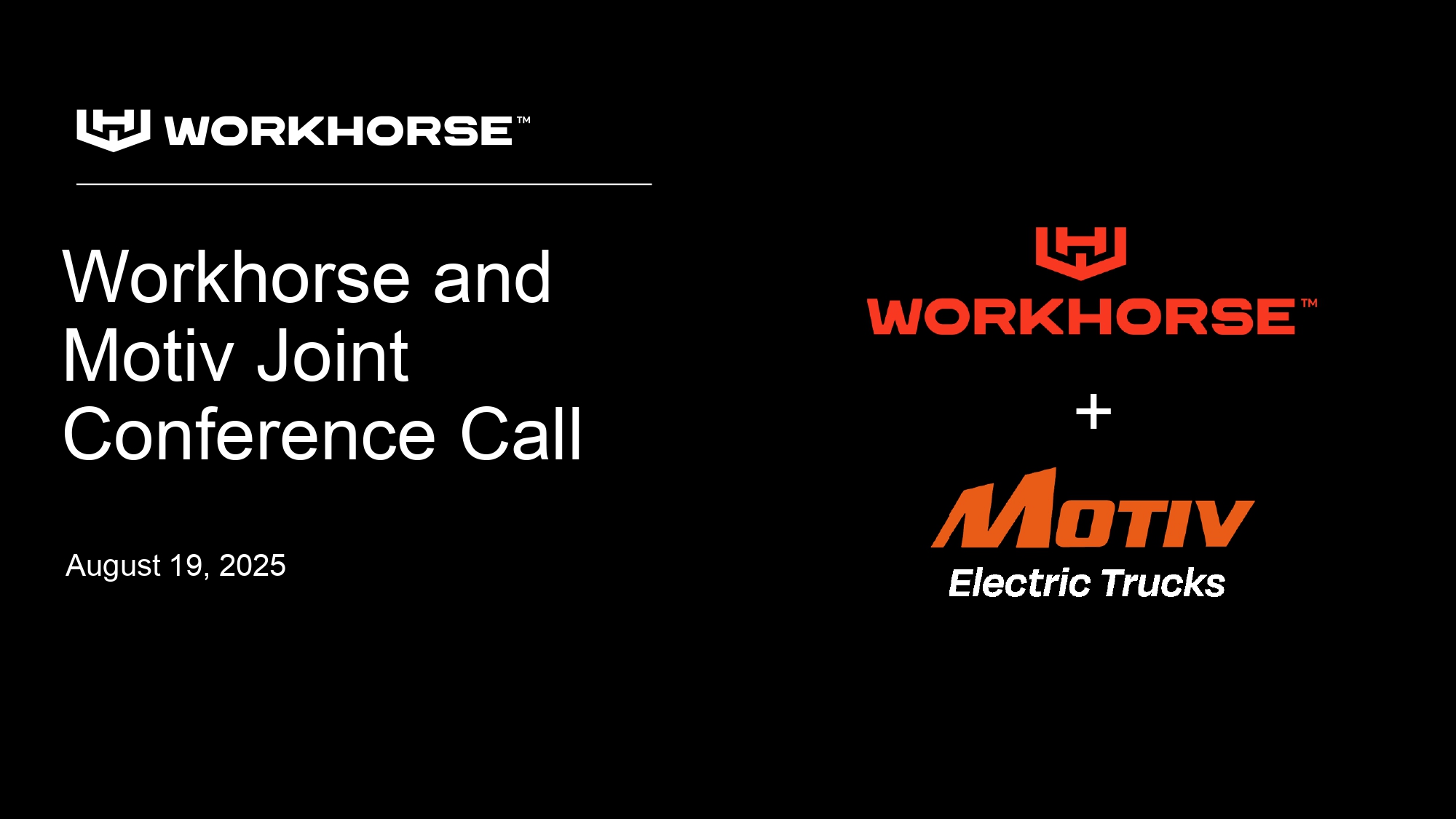 © Copyright 2025 Workhorse. Confidential & Proprietary | 2 Legal Legends Cautionary Note Regarding Forward - Looking Statements This communication contains “forward - looking statements” within the meaning of Section 21E of the Exchange Act, and the Private Securities Litigation Reform Act of 1995, as amended. All statements other than statements of historical fact included or incorporated by reference in this communication, including, among other things, statements regarding the proposed me rger transaction between Workhorse and Motiv, future events, plans and anticipated results of operations, business strategies, the anticipated benefits of the proposed transaction, the anticipated impact of the proposed transaction on the combined company’s business and future financial and operating results, the expected amount and timing of synergies from the proposed transaction, the anticipated closing date for the proposed transaction and other aspects of the c omb ined company’s operations or operating results are forward - looking statements. Some of these statements may be identified by the use of the words “plans”, “expects” or “does not expect”, “estimated”, “is expected”, “budget”, “schedul ed” , “estimates”, “forecasts”, “intends”, “anticipates” or “does not anticipate”, “targets”, “projects”, “contemplates”, “predicts”, “potential”, “continue”, or “believes”, or variations of such words and phrases or state that certain actions, ev ent s or results “may”, “could”, “would”, “should”, “might”, “will” or “will be taken”, “occur” or “be achieved”. Forward - looking statements are based on the opinions and estimates of management of Workhorse as of the date such statements are made, and they are subject to known and unknown risks, uncertainties, assumptions and other factors that may cause the actual results, level of activity, performance or achievements to be materially different from those expre sse d or implied by such forward - looking statements. These risks and uncertainties could give rise to a delay in or the failure to consummate the Merger or the other transactions described herein (collectively, the “Transactions”). Some factors tha t could cause actual results to differ include the outcome of continuing discussions between the Workhorse and Motiv with respect to the Transactions, including the possibility that the parties may terminate certain of the Transactions or that the terms of certain of the Transactions may change; our ability to consummate the Transactions or achieve the expected synergies and/or efficiencies; potential regulatory delays; the industry and market reaction to this announcement; t he effect of the announcement of the Transactions on the ability of the parties to operate their businesses and retain and hire key personnel and to maintain favorable business relationships; the possibility that the integration of the parties may be more difficult, time - consuming or costly than expected or that operating costs and business disruptions may be greater than expected; the ability to obtain regulatory and other approvals required to consummate the Transactions, includin g f rom Nasdaq; the risk that the price of our securities may be volatile due to a variety of factors; changes in laws, regulations, technologies, the global supply chain, and macro - economic and social environments affecting our business; and our a bility to maintain compliance with Nasdaq rules and otherwise maintain our listing of securities on Nasdaq. Additional information on these and other factors that may cause actual results and Workhorse’s performance to differ materia lly is included in Workhorse’s periodic reports filed with the SEC, including, but not limited to, Workhorse’s Annual Report on Form 10 - K for the year ended December 31, 2024, including those factors described under the heading “Risk Factors” the rein, and Workhorse’s subsequent Quarterly Reports on Form 10 - Q. Copies of Workhorse’s filings with the SEC are available publicly on the SEC’s website at www.sec.gov or may be obtained by contacting Workhorse. Should one or more of these risks or uncertainties materialize, or should any of ou r assumptions prove incorrect, actual results may vary in material respects from those projected in these forward - looking statements. Readers are cautioned not to place undue reliance upon any forward - looking statements, which speak only as of the date made. These forward - looking statements are made only as of the date hereof, and Workhorse undertakes no obligations to update or revise the forward - looking statements, whether as a result of new information, future events or otherwise, except as required by law. Additional Information and Where to Find It Workhorse intends to file with the SEC a Proxy Statement on Schedule 14A (the “Proxy Statement”). Workhorse may also file oth er relevant documents with the SEC regarding the transactions described herein. This document is not a substitute for the Proxy Statement or any other document that Workhorse may file with the SEC. Any Definitive Proxy Statement (i f and when available) will be mailed to shareholders of Workhorse. STOCKHOLDERS OF WORKHORSE ARE URGED TO READ THE PROXY STATEMENT AND ANY OTHER DOCUMENTS FILED OR TO BE FILED WITH THE SEC IN CONNECTION WITH THE TRANSACTIO NS DESCRIBED HEREIN, AS WELL AS ANY AMENDMENTS OR SUPPLEMENTS TO THESE DOCUMENTS, CAREFULLY AND IN THEIR ENTIRETY IF AND WHEN THEY BECOME AVAILABLE, AS THEY CONTAIN OR WILL CO NTA IN IMPORTANT INFORMATION ABOUT WORKHORSE, THE PROPOSED TRANSACTIONS DESCRIBED HEREIN, AND RELATED MATTERS. Stockholders will be able to obtain a free copy of the Proxy Statem ent (if and when available) and other relevant documents once such documents are filed with the SEC from the SEC’s website at www.sec.gov , or by directing a request by 