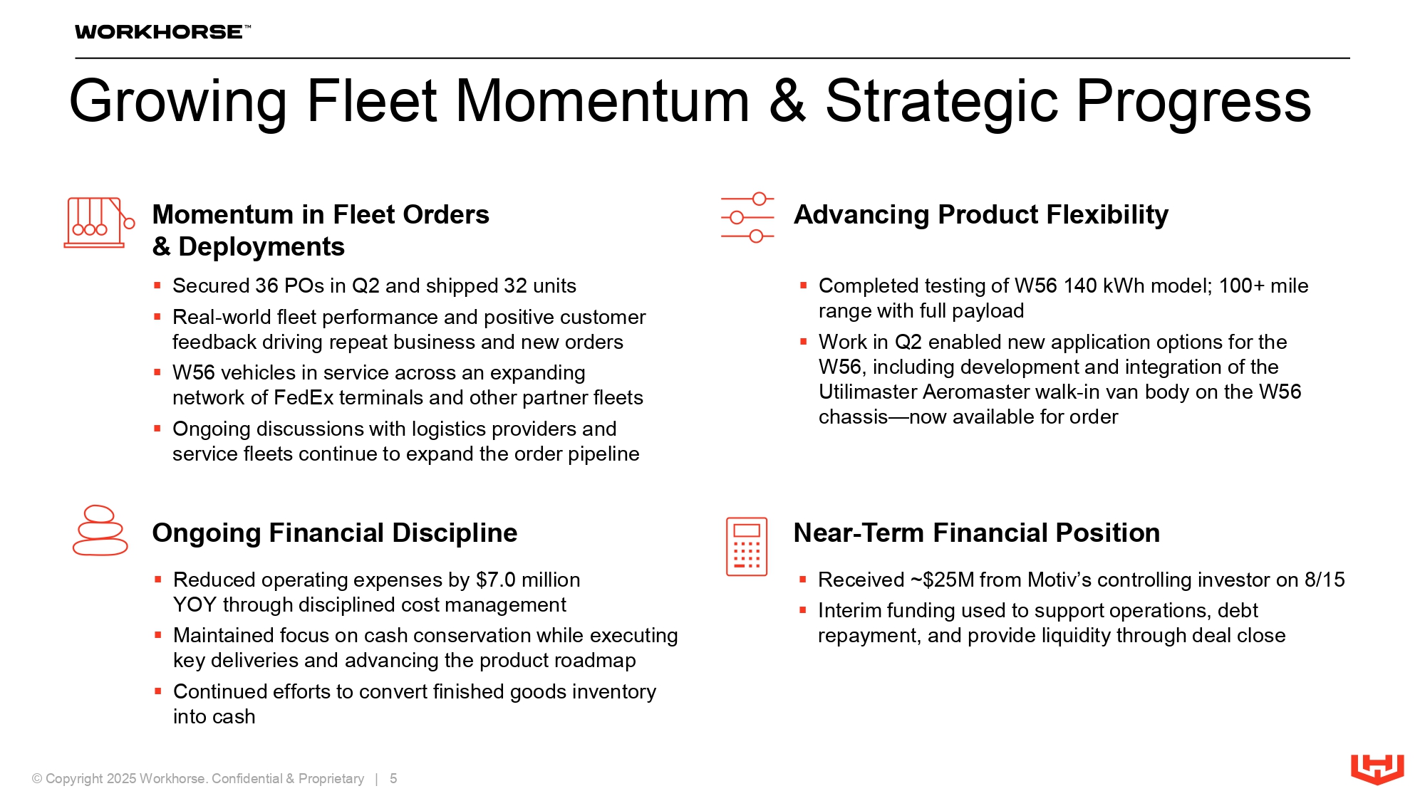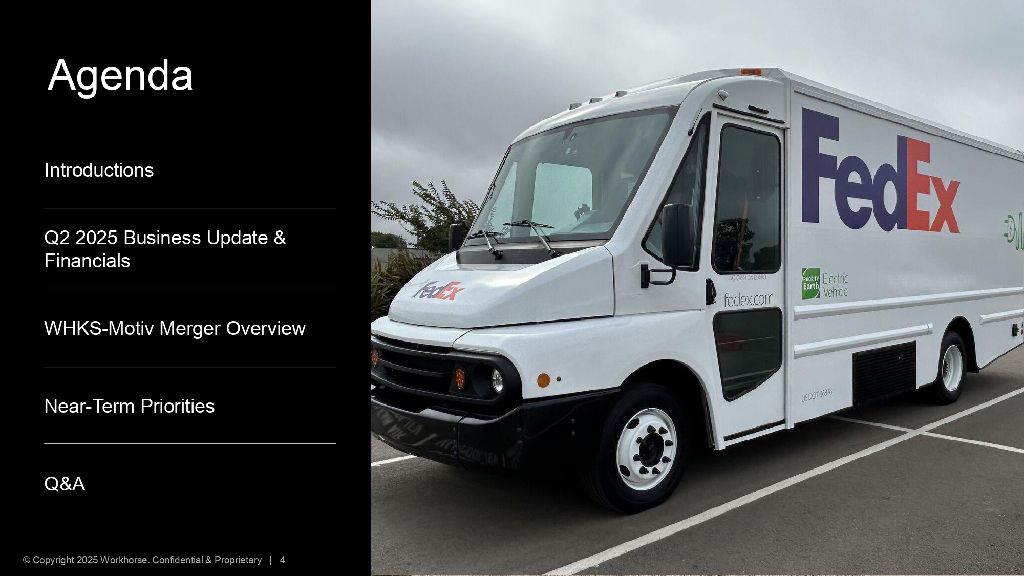 © Copyright 2025 Workhorse. Confidential & Proprietary | 4 Agenda Introductions Q2 2025 Business Update & Financials WHKS - Motiv Merger Overview Near - Term Priorities Q&A Updated for Q2 and new photo Can we use a Vestis or FedEx logo'd truck?