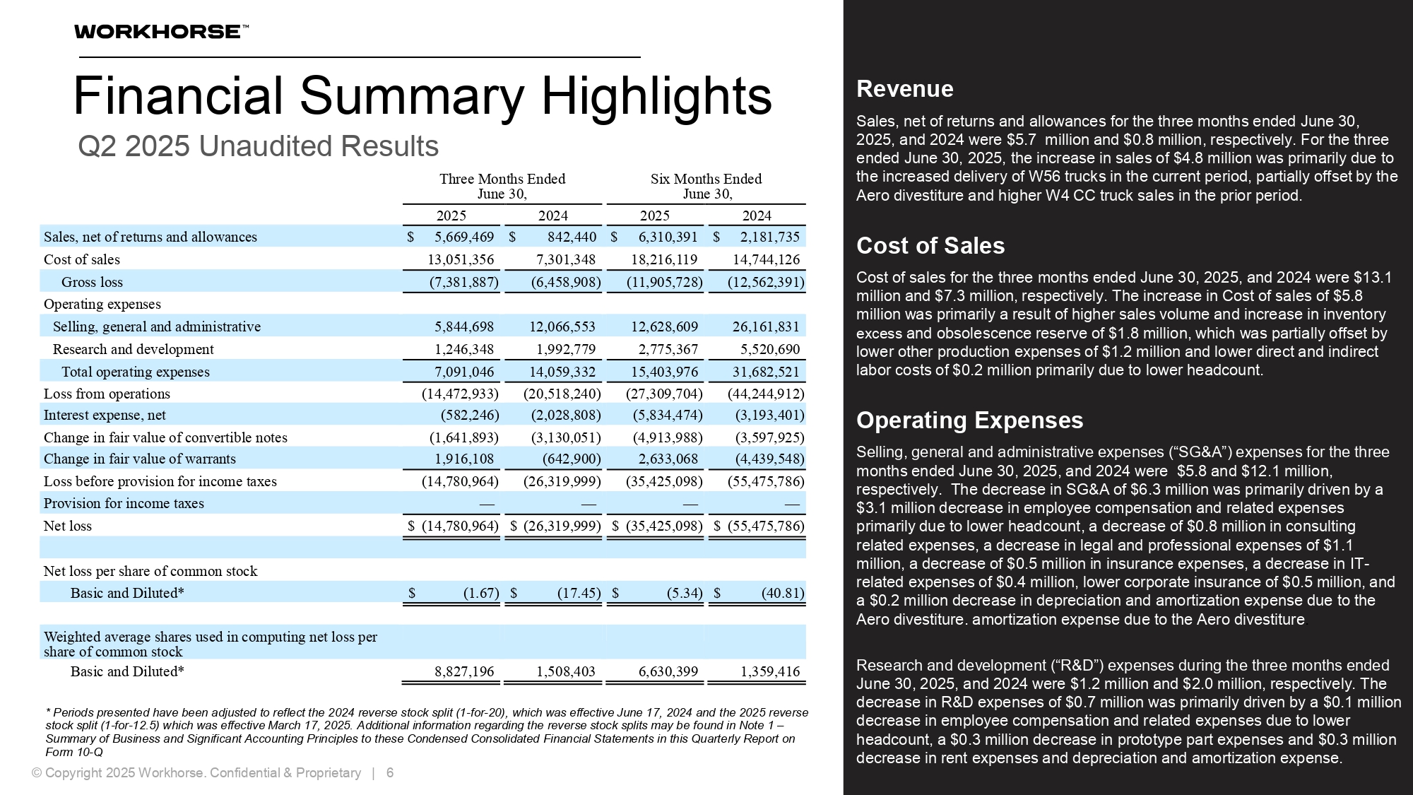 © Copyright 2025 Workhorse. Confidential & Proprietary | 6 Financial Summary Highlights Q2 2025 Unaudited Results Revenue Sales, net of returns and allowances for the three months ended June 30, 2025, and 2024 were $5.7 million and $0.8 million, respectively. For the three ended June 30, 2025, the increase in sales of $4.8 million was primarily due to the increased delivery of W56 trucks in the current period, partially offset by the Aero divestiture and higher W4 CC truck sales in the prior period. Cost of Sales Cost of sales for the three months ended June 30, 2025, and 2024 were $13.1 million and $7.3 million, respectively. The increase in Cost of sales of $5.8 million was primarily a result of higher sales volume and increase in inventory excess and obsolescence reserve of $1.8 million, which was partially offset by lower other production expenses of $1.2 million and lower direct and indirect labor costs of $0.2 million primarily due to lower headcount. Operating Expenses Selling, general and administrative expenses (“SG&A”) expenses for the three months ended June 30, 2025, and 2024 were $5.8 and $12.1 million, respectively. The decrease in SG&A of $6.3 million was primarily driven by a $3.1 million decrease in employee compensation and related expenses primarily due to lower headcount, a decrease of $0.8 million in consulting related expenses, a decrease in legal and professional expenses of $1.1 million, a decrease of $0.5 million in insurance expenses, a decrease in IT - related expenses of $0.4 million, lower corporate insurance of $0.5 million, and a $0.2 million decrease in depreciation and amortization expense due to the Aero divestiture. amortization expense due to the Aero divestiture . Research and development (“R&D”) expenses during the three months ended June 30, 2025, and 2024 were $1.2 million and $2.0 million, respectively. The decrease in R&D expenses of $0.7 million was primarily driven by a $0.1 million decrease in employee compensation and related expenses due to lower headcount, a $0.3 million decrease in prototype part expenses and $0.3 million decrease in rent expenses and depreciation and amortization expense. * Periods presented have been adjusted to reflect the 2024 reverse stock split (1 - for - 20), which was effective June 17, 2024 and the 2025 reverse stock split (1 - for - 12.5) which was effective March 17, 2025. Additional information regarding the reverse stock splits may be fo und in Note 1 – Summary of Business and Significant Accounting Principles to these Condensed Consolidated Financial Statements in this Quarte rly Report on Form 10 - Q Three Months Ended June 30, Six Months Ended June 30, 2025 2024 2025 2024 Sales, net of returns and allowances $ 5,669,469 $ 842,440 $ 6,310,391 $ 2,181,735 Cost of sales 13,051,356 7,301,348 18,216,119 14,744,126 Gross loss (7,381,887) (6,458,908) (11,905,728) (12,562,391) Operating expenses Selling, general and administrative 5,844,698 12,066,553 12,628,609 26,161,831 Research and development 1,246,348 1,992,779 2,775,367 5,520,690 Total operating expenses 7,091,046 14,059,332 15,403,976 31,682,521 Loss from operations (14,472,933) (20,518,240) (27,309,704) (44,244,912) Interest expense, net (582,246) (2,028,808) (5,834,474) (3,193,401) Change in fair value of convertible notes (1,641,893) (3,130,051) (4,913,988) (3,597,925) Change in fair value of warrants 1,916,108 (642,900) 2,633,068 (4,439,548) Loss before provision for income taxes (14,780,964) (26,319,999) (35,425,098) (55,475,786) Provision for income taxes — — — — Net loss $ (14,780,964) $ (26,319,999) $ (35,425,098) $ (55,475,786) Net loss per share of common stock Basic and Diluted* $ (1.67) $ (17.45) $ (5.34) $ (40.81) Weighted average shares used in computing net loss per share of common stock Basic and Diluted* 8,827,196 1,508,403 6,630,399 1,359,416