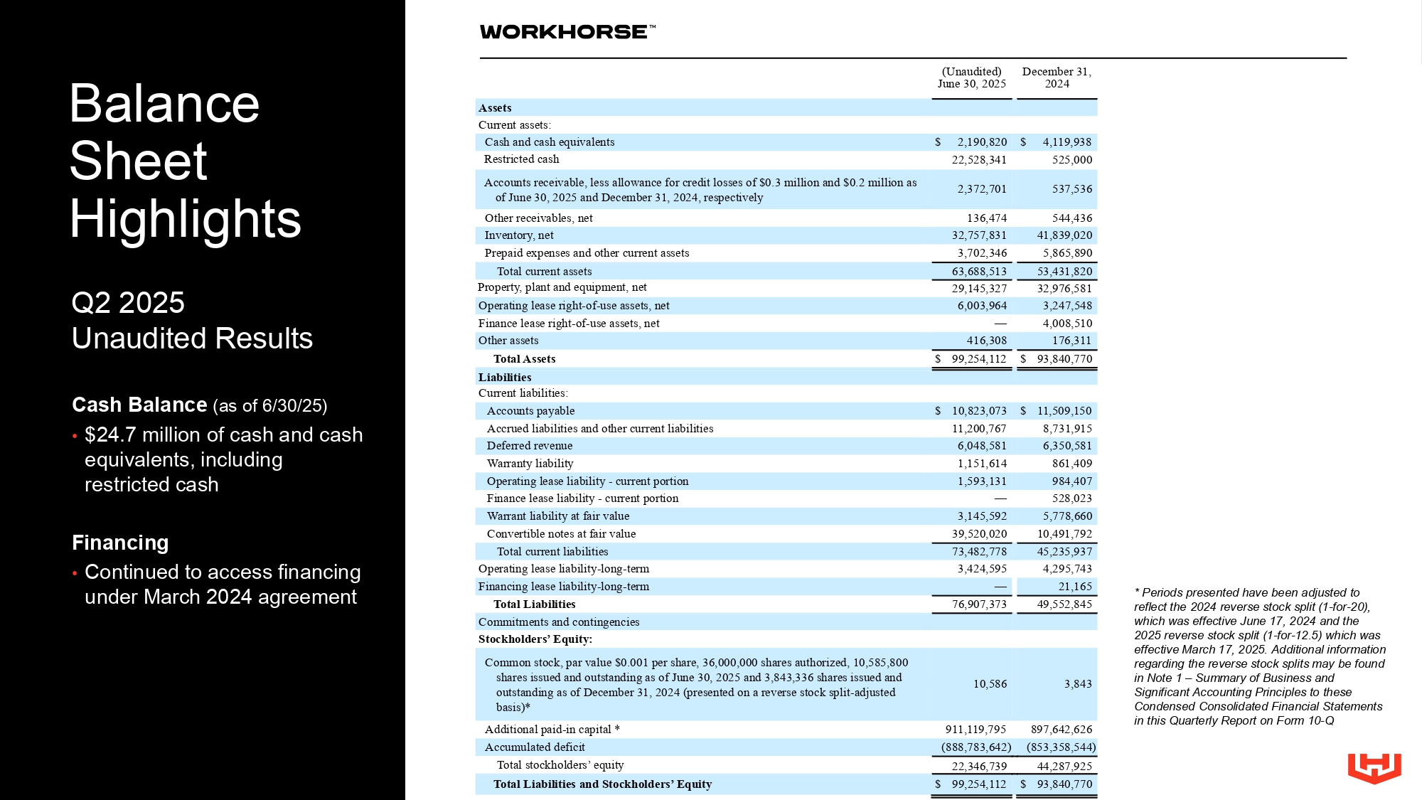 © Copyright 2025 Workhorse. Confidential & Proprietary | 7 © Copyright 2025 Workhorse. Confidential & Proprietary | 7 Balance Sheet Highlights Q2 2025 Unaudited Results Strengthening our balance sheet and liquidity position to better execute on our product roadmap and deliver for our customers Cash Balance (as of 6/30/25) • $24.7 million of cash and cash equivalents, including restricted cash Financing • Continued to access financing under March 2024 agreement * Periods presented have been adjusted to reflect the 2024 reverse stock split (1 - for - 20), which was effective June 17, 2024 and the 2025 reverse stock split (1 - for - 12.5) which was effective March 17, 2025. Additional information regarding the reverse stock splits may be found in Note 1 – Summary of Business and Significant Accounting Principles to these Condensed Consolidated Financial Statements in this Quarterly Report on Form 10 - Q (Unaudited) June 30, 2025 December 31, 2024 Assets Current assets: Cash and cash equivalents $ 2,190,820 $ 4,119,938 Restricted cash 22,528,341 525,000 Accounts receivable, less allowance for credit losses of $0.3 million and $0.2 million as of June 30, 2025 and December 31, 2024, respectively 2,372,701 537,536 Other receivables, net 136,474 544,436 Inventory, net 32,757,831 41,839,020 Prepaid expenses and other current assets 3,702,346 5,865,890 Total current assets 63,688,513 53,431,820 Property, plant and equipment, net 29,145,327 32,976,581 Operating lease right-of-use assets, net 6,003,964 3,247,548 Finance lease right-of-use assets, net — 4,008,510 Other assets 416,308 176,311 Total Assets $ 99,254,112 $ 93,840,770 Liabilities Current liabilities: Accounts payable $ 10,823,073 $ 11,509,150 Accrued liabilities and other current liabilities 11,200,767 8,731,915 Deferred revenue 6,048,581 6,350,581 Warranty liability 1,151,614 861,409 Operating lease liability - current portion 1,593,131 984,407 Finance lease liability - current portion — 528,023 Warrant liability at fair value 3,145,592 5,778,660 Convertible notes at fair value 39,520,020 10,491,792 Total current liabilities 73,482,778 45,235,937 Operating lease liability-long-term 3,424,595 4,295,743 Financing lease liability-long-term — 21,165 Total Liabilities 76,907,373 49,552,845 Commitments and contingencies Stockholders’ Equity: Common stock, par value $0.001 per share, 36,000,000 shares authorized, 10,585,800 shares issued and outstanding as of June 30, 2025 and 3,843,336 shares issued and outstanding as of December 31, 2024 (presented on a reverse stock split-adjusted basis)* 10,586 3,843 Additional paid-in capital * 911,119,795 897,642,626 Accumulated deficit (888,783,642) (853,358,544) Total stockholders’ equity 22,346,739 44,287,925 Total Liabilities and Stockholders’ Equity $ 99,254,112 $ 93,840,770