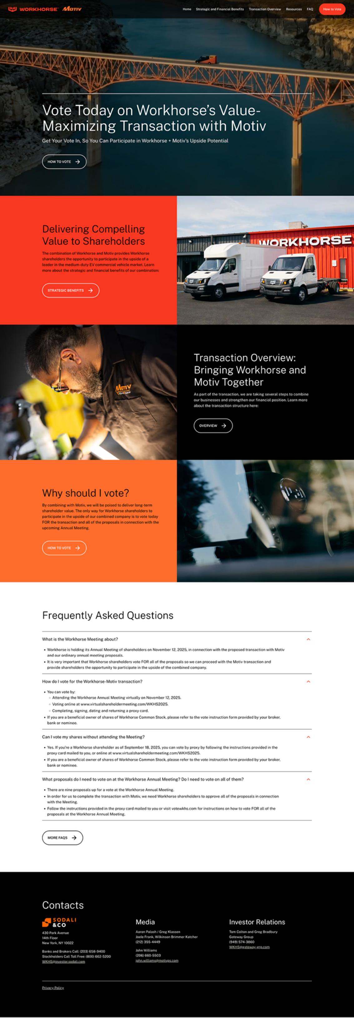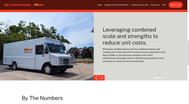 This communication contains “forward-looking statements” within the meaning of Section 21E of the Exchange Act, and the Private Securities Litigation Reform Act of 1995, as amended. All statements other than statements of historical fact included or incorporated by reference in this communication, including, among other things, statements regarding the proposed merger transaction between Workhorse and Motiv, future events, plans and anticipated results of operations, business strategies, the anticipated benefits of the proposed transaction, the anticipated impact of the proposed transaction on the combined company’s business and future financial and operating results, the expected amount and timing of synergies from the proposed transaction, the anticipated closing date for the proposed transaction and other aspects of the combined company’s operations or operating results are forward-looking statements. Forward-looking statements may be identified by the use of the words “believe”, “plan”, “expect”, “estimate”, “budget”, “schedule”, “forecast”, “intend”, “anticipate”, “target”, “project”, “contemplate”, “predict”, “potential”, or “continue”, and similar words or variations of such words and phrases or state that certain actions, events or results “may”, “could”, “would”, “should”, “might”, “will” or “will be taken”, “occur” or “be achieved”. However, the absence of these words does not mean that the statements are not forward-looking. Where, in any forward-looking statement, Workhorse expresses an expectation or belief as to future results, such expectation or belief is expressed in good faith and believed to be reasonable at the time such forward-looking statement is made. However, these statements are not guarantees of future performance and involve certain risks, uncertainties and other factors beyond the parties’ control. Therefore, actual outcomes and results may differ materially from what is expressed or forecast in the forward-looking statements.