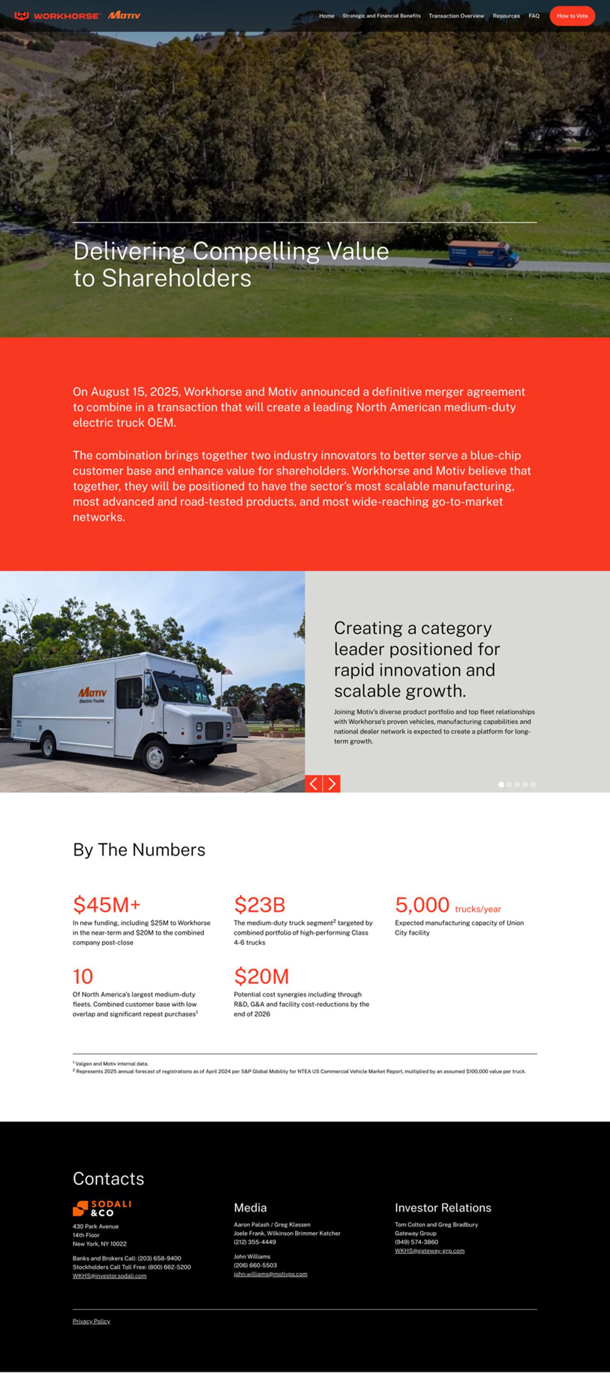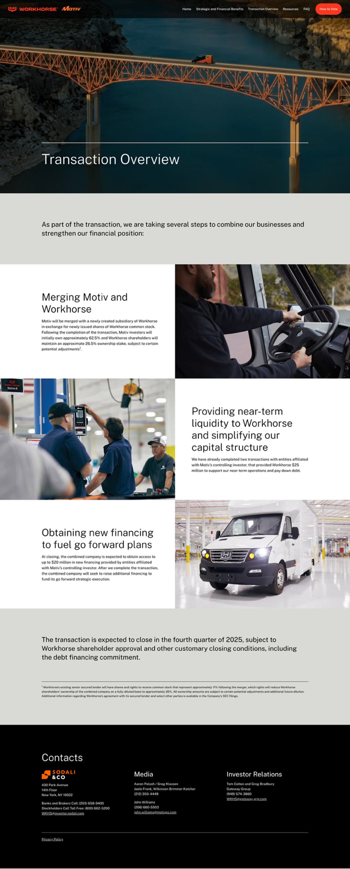 The following risks and uncertainties, among others, could cause actual results or events to differ materially from those described in forward-looking statements: the parties’ ability to successfully integrate their businesses and technologies, which may result in the combined company not operating as effectively and efficiently as expected; the risk that the expected benefits and synergies of the proposed transaction may not be fully achieved in a timely manner, or at all; the risk associated with Workhorse’s ability to obtain the approval of its shareholders required to consummate the proposed transaction and the timing of the closing of the proposed transaction, including the risk that the conditions to the transaction are not satisfied on a timely basis or at all or the failure of the transaction to close for any other reason or to close on the anticipated terms; the risk that any regulatory approval, consent or authorization that may be required for the proposed transaction is not obtained or is obtained subject to conditions that are not anticipated; the occurrence of any event, change or other circumstance that could give rise to the termination of the proposed transaction; unanticipated difficulties, liabilities or expenditures relating to the transaction; the effect of the announcement, pendency or completion of the proposed transaction on the parties’ business relationships and business operations generally; the effect of the announcement or pendency of the proposed transaction on Workhorse’s common stock prices and uncertainty as to the long-term value of the combined company’s common stock; risks that the proposed transaction disrupts current plans and operations of the parties and their respective management teams and potential difficulties in hiring or retaining employees as a result of the proposed transaction; our ability to develop and manufacture our product portfolio, including the W4 CC, W750, and W56 and other programs; our ability to attract and retain customers for our existing and new products; ongoing and anticipated changes in the U.S. political environment, including those resulting from the new Presidential Administration, control of Congress, and changes to regulatory agencies; the implementation of changes to the existing tariff regime by the new Presidential Administration and measures taken in response to such tariffs by foreign governments; risks associated with obtaining orders and executing upon such orders; the unavailability, reduction, elimination or adverse application of government subsidies and incentives or any challenge to or failure by the federal government, states or other governmental entities to adopt or enforce regulations such as the California Air Resource Board’s Advanced Clean Fleet regulation; changes in attitude toward environmental, social, and governance matters among regulators, investors, and parties with which we do business; supply chain disruptions, including constraints on steel, semiconductors and other material inputs and resulting cost increases impacting us, our customers, our suppliers or the industry; our ability to capitalize on opportunities to deliver products to meet customer requirements; our limited operations and need to expand and enhance elements of our production process to fulfill product orders; our general inability to raise additional capital to fund our operations and business plan; our ability to receive sufficient proceeds from our current and any future financing arrangements to meet our immediate liquidity needs and the potential costs, dilution and restrictions resulting from any such financing; our ability to maintain compliance with the listing requirements of the Nasdaq and the impact of any steps we have taken, including reverse splits of our common stock, on our operations, stock price and future access to funds; our ability to protect our intellectual property; market acceptance of our products; our ability to obtain sufficient liquidity from operations and financing activities to continue as a going concern and, our ability to control our expenses; the effectiveness of our cost control measures and impact such measures could have on our operations, including the effects of furloughing employees; potential competition, including without limitation shifts in technology; volatility in and deterioration of national and international capital markets and economic conditions; global and local business conditions; acts of war (including without limitation the conflicts in Ukraine and the Middle East) and/or terrorism; the prices being charged by our competitors; our inability to retain key members of our management team; our inability to satisfy our customer warranty claims; the outcome of any regulatory or legal proceedings, including with Coulomb Solutions Inc.; our ability to realize the benefits of the sale and leaseback transaction of our Union City Facility; and other risks and uncertainties and other factors discussed from time to time in our filings with the Securities and Exchange Commission (“SEC”).