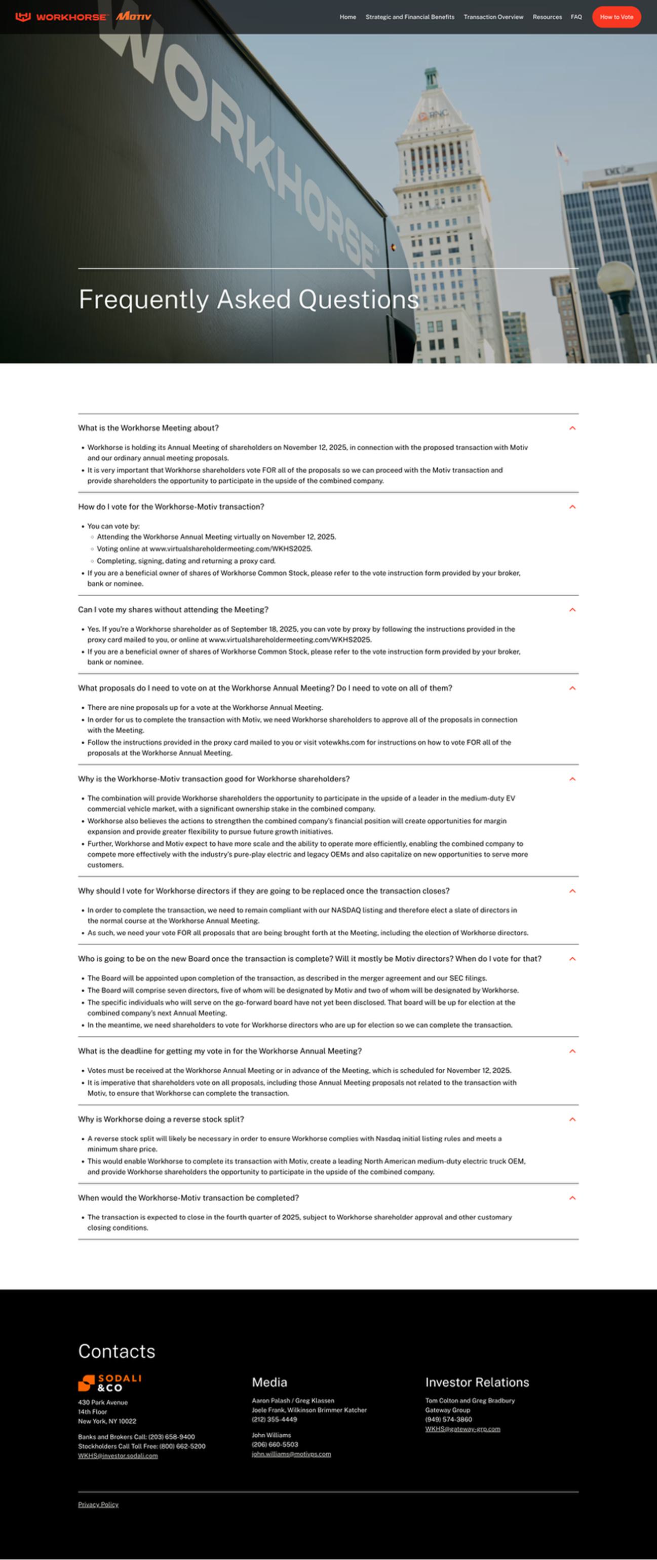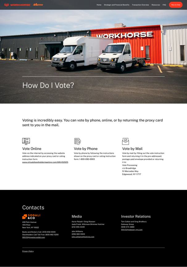 Workhorse has filed with the U.S. Securities and Exchange Commission (the “SEC”) a definitive proxy statement on Schedule 14A (the “Definitive Proxy Statement”) and a proxy card with respect to its solicitation of proxies for Workhorse’s 2025 Annual Meeting of Stockholders (the “Annual Meeting”). The Definitive Proxy Statement contains important information about the matters to be voted on at the Annual Meeting. STOCKHOLDERS OF WORKHORSE ARE URGED TO READ THESE MATERIALS CAREFULLY AND IN THEIR ENTIRETY (INCLUDING ANY AMENDMENTS OR SUPPLEMENTS THERETO) AND ANY OTHER RELEVANT DOCUMENTS THAT WORKHORSE HAS FILED OR WILL FILE WITH THE SEC BECAUSE THEY CONTAIN OR WILL CONTAIN IMPORTANT INFORMATION ABOUT WORKHORSE AND THE MATTERS TO BE VOTED ON AT THE ANNUAL MEETING. Stockholders are able to obtain a free copy of the Proxy Statement and other relevant documents once such documents are filed with the SEC from the SEC’s website at www.sec.gov, or by directing a request by mail to Workhorse Group Inc., 3600 Park 42 Drive, Suite 160E, Sharonville, Ohio 45241, or from the Workhorse’s website at www.ir.workhorse.com.