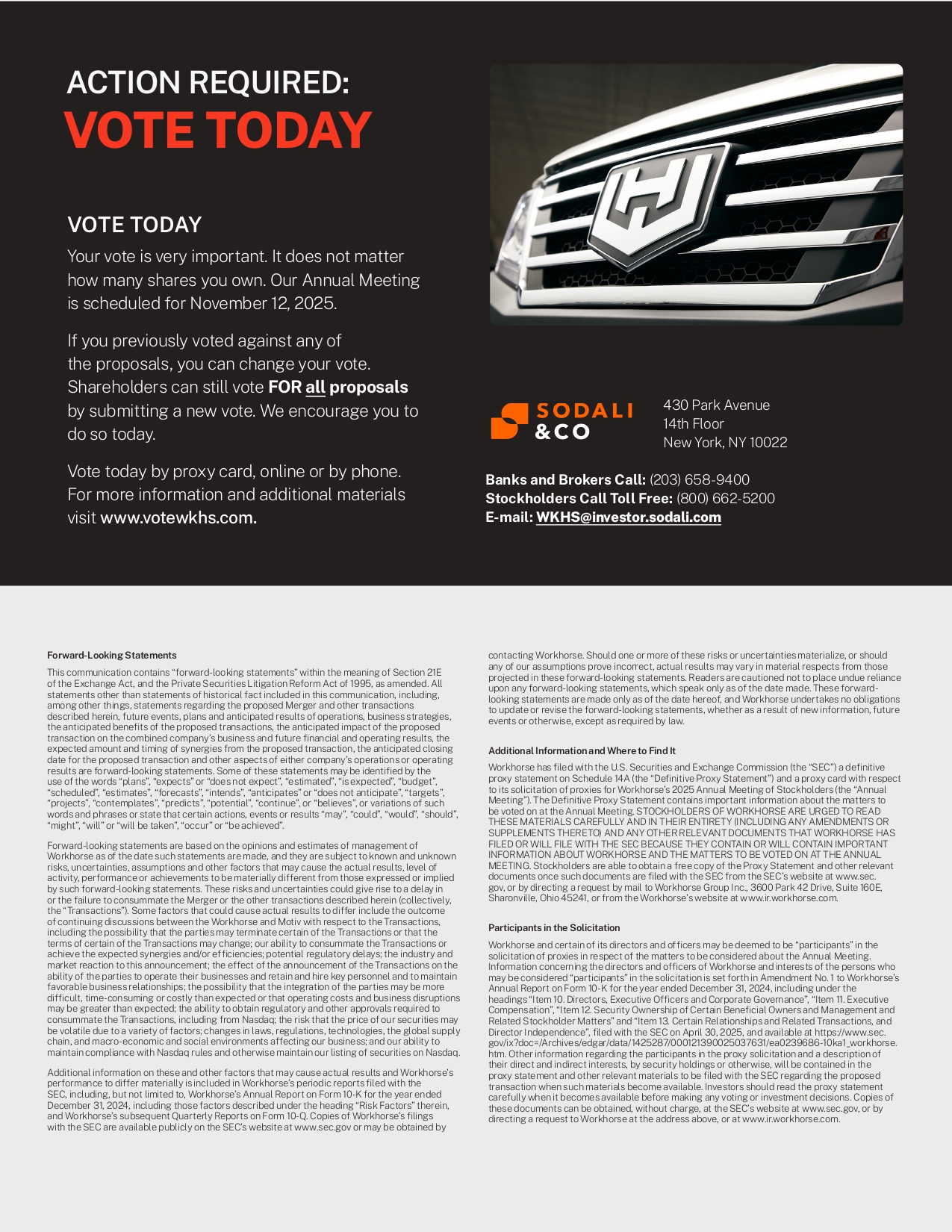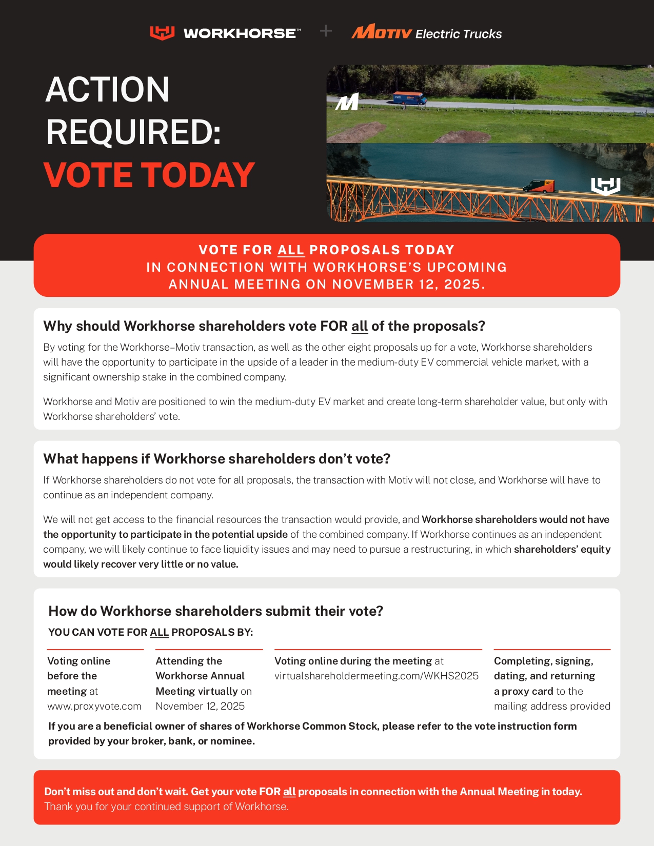 ACTION REQUIRED: VOTE TODAY VOTE FOR ALL PROPOSALS TODAY IN CONNECTION WITH WORKHORSE’ S UPCOMING ANNUAL MEETING ON NOVEMBER 12 , 2025 . Why should Workhorse shareholders vote FOR all of the proposals? By voting for the Workhorse – Motiv transaction, as well as the other eight proposals up for a vote, Workhorse shareholders will have the opportunity to participate in the upside of a leader in the medium - duty EV commercial vehicle market, with a significant ownership stake in the combined company. Workhorse and Motiv are positioned to win the medium - duty EV market and create long - term shareholder value, but only with Workhorse shareholders’ vote. What happens if Workhorse shareholders don’t vote? If Workhorse shareholders do not vote for all proposals, the transaction with Motiv will not close, and Workhorse will have to continue as an independent company. We will not get access to the financial resources the transaction would provide, and Workhorse shareholders would not have the opportunity to participate in the potential upside of the combined company. If Workhorse continues as an independent company, we will likely continue to face liquidity issues and may need to pursue a restructuring, in which shareholders’ equity would likely recover very little or no value. How do Workhorse shareholders submit their vote? YOU CAN VOTE FOR ALL PROPOSALS BY: If you are a beneficial owner of shares of Workhorse Common Stock, please refer to the vote instruction form provided by your broker, bank, or nominee. Voting online before the meeting at www.proxyvote.com Attending the Workhorse Annual Meeting virtually on November 12, 2025 Voting online during the meeting at virtualshareholdermeeting.com/WKHS2025 Completing, signing, dating, and returning a proxy card to the mailing address provided Don’t miss out and don’t wait. Get your vote FOR all proposals in connection with the Annual Meeting in today. Thank you for your continued support of Workhorse.