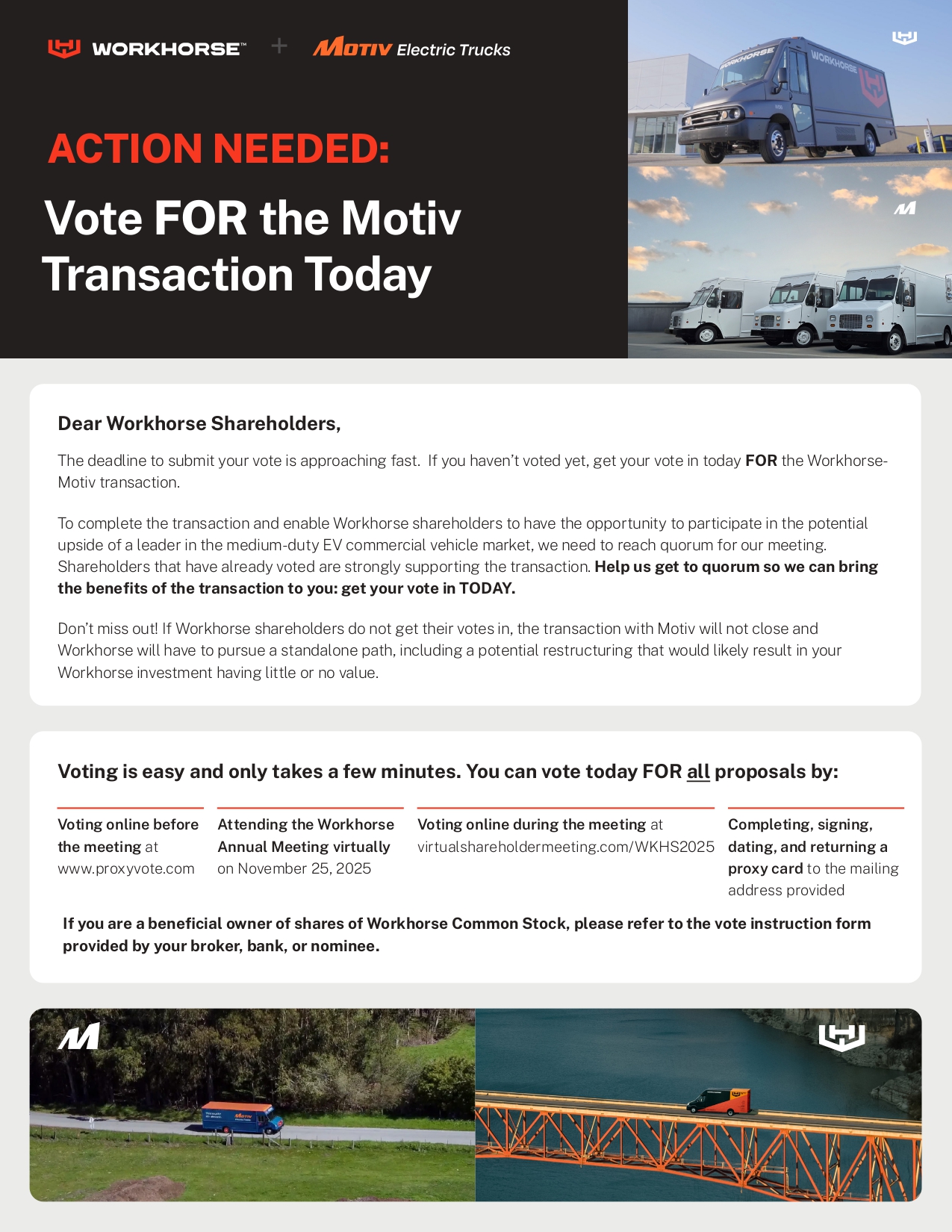 Workhorse has filed with the U.S. Securities and Exchange Commission (the “SEC”) a definitive proxy statement on Schedule 14A (the “Definitive Proxy Statement”) and a proxy card with respect to its solicitation of proxies for Workhorse’s 2025 Annual Meeting of Stockholders (the “Annual Meeting”). The Definitive Proxy Statement contains important information about the matters to be voted on at the Annual Meeting. STOCKHOLDERS OF WORKHORSE ARE URGED TO READ THESE MATERIALS CAREFULLY AND IN THEIR ENTIRETY (INCLUDING ANY AMENDMENTS OR SUPPLEMENTS THERETO) AND ANY OTHER RELEVANT DOCUMENTS THAT WORKHORSE HAS FILED OR WILL FILE WITH THE SEC BECAUSE THEY CONTAIN OR WILL CONTAIN IMPORTANT INFORMATION ABOUT WORKHORSE AND THE MATTERS TO BE VOTED ON AT THE ANNUAL MEETING. Stockholders are able to obtain a free copy of the Proxy Statement and other relevant documents once such documents are filed with the SEC from the SEC’s website at www.sec.gov, or by directing a request by mail to Workhorse Group Inc., 3600 Park 42 Drive, Suite 160E, Sharonville, Ohio 45241, or from the Workhorse’s website at www.ir.workhorse.com.