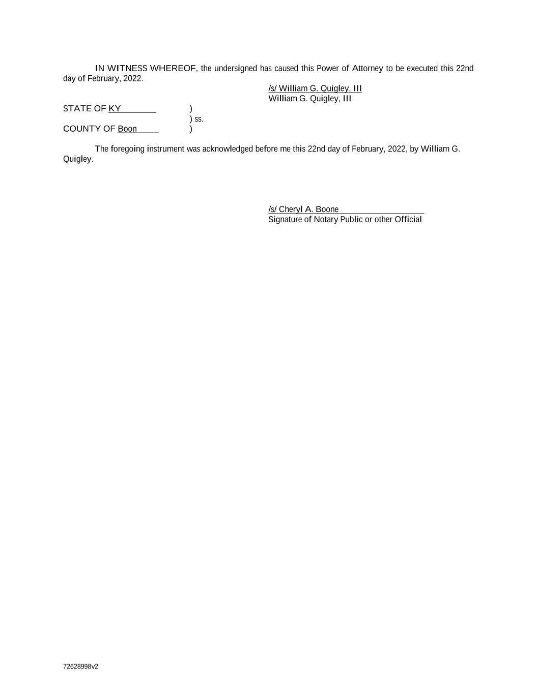 72628998v2 IN WITNESS WHEREOF, the undersigned has caused this Power of Attorney to be executed this 22nd day of February, 2022. /s/ William G. Quigley, III William G. Quigley, III STATE OF KY ) ) ss. COUNTY OF Boon ) The foregoing instrument was acknowledged before me this 22nd day of February, 2022, by William G. Quigley. /s/ Cheryl A. Boone Signature of Notary Public or other Official