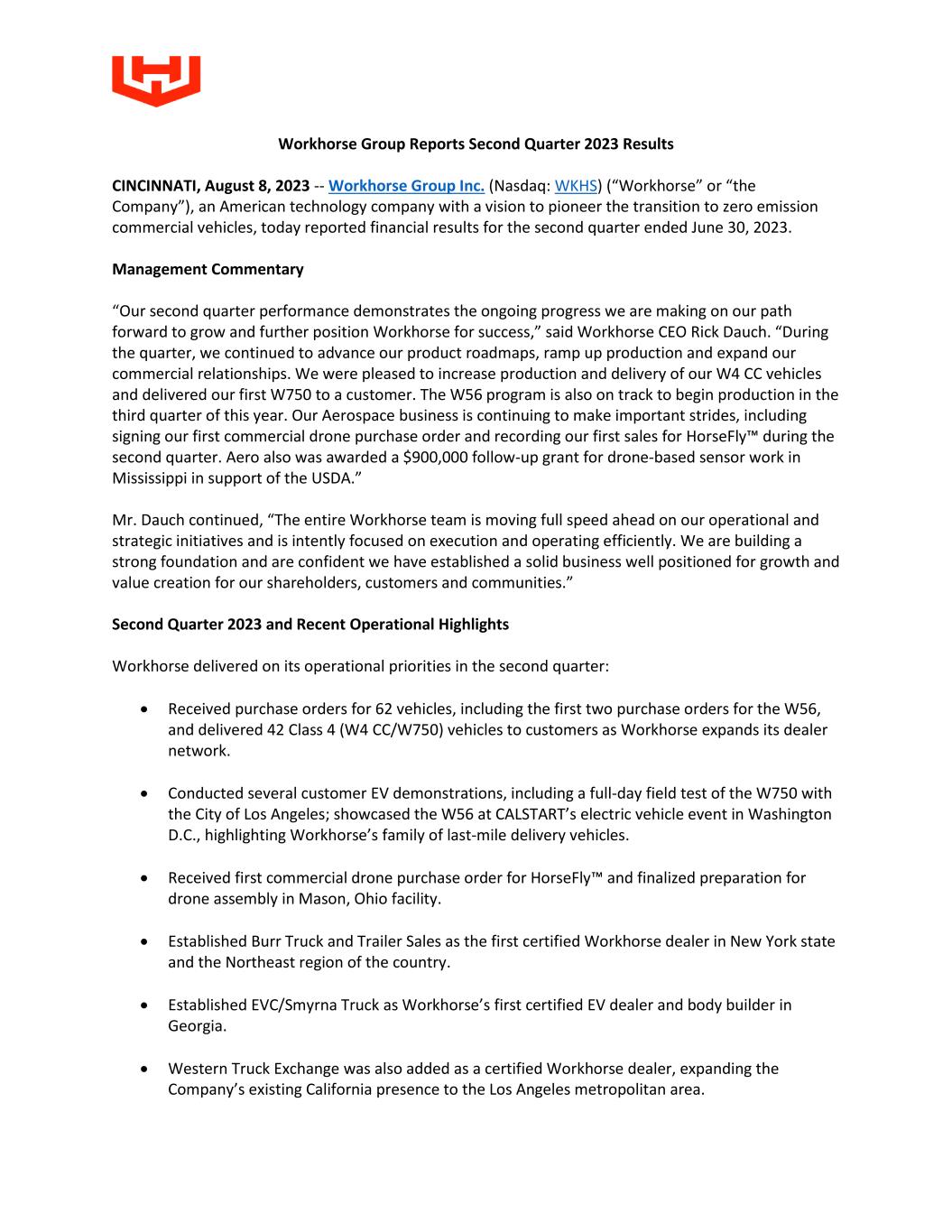 Workhorse Group Reports Second Quarter 2023 Results CINCINNATI, August 8, 2023 -- Workhorse Group Inc. (Nasdaq: WKHS) (“Workhorse” or “the Company”), an American technology company with a vision to pioneer the transition to zero emission commercial vehicles, today reported financial results for the second quarter ended June 30, 2023. Management Commentary “Our second quarter performance demonstrates the ongoing progress we are making on our path forward to grow and further position Workhorse for success,” said Workhorse CEO Rick Dauch. “During the quarter, we continued to advance our product roadmaps, ramp up production and expand our commercial relationships. We were pleased to increase production and delivery of our W4 CC vehicles and delivered our first W750 to a customer. The W56 program is also on track to begin production in the third quarter of this year. Our Aerospace business is continuing to make important strides, including signing our first commercial drone purchase order and recording our first sales for HorseFly™ during the second quarter. Aero also was awarded a $900,000 follow-up grant for drone-based sensor work in Mississippi in support of the USDA.” Mr. Dauch continued, “The entire Workhorse team is moving full speed ahead on our operational and strategic initiatives and is intently focused on execution and operating efficiently. We are building a strong foundation and are confident we have established a solid business well positioned for growth and value creation for our shareholders, customers and communities.” Second Quarter 2023 and Recent Operational Highlights Workhorse delivered on its operational priorities in the second quarter: • Received purchase orders for 62 vehicles, including the first two purchase orders for the W56, and delivered 42 Class 4 (W4 CC/W750) vehicles to customers as Workhorse expands its dealer network. • Conducted several customer EV demonstrations, including a full-day field test of the W750 with the City of Los Angeles; showcased the W56 at CALSTART’s electric vehicle event in Washington D.C., highlighting Workhorse’s family of last-mile delivery vehicles. • Received first commercial drone purchase order for HorseFly™ and finalized preparation for drone assembly in Mason, Ohio facility. • Established Burr Truck and Trailer Sales as the first certified Workhorse dealer in New York state and the Northeast region of the country. • Established EVC/Smyrna Truck as Workhorse’s first certified EV dealer and body builder in Georgia. • Western Truck Exchange was also added as a certified Workhorse dealer, expanding the Company’s existing California presence to the Los Angeles metropolitan area.