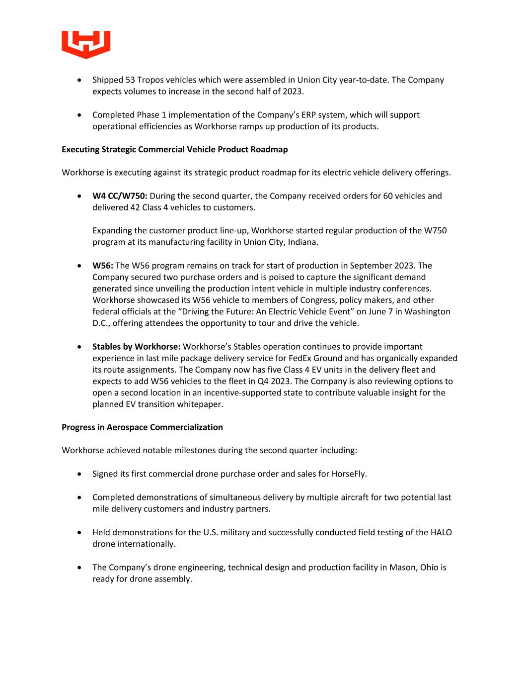 • Shipped 53 Tropos vehicles which were assembled in Union City year-to-date. The Company expects volumes to increase in the second half of 2023. • Completed Phase 1 implementation of the Company’s ERP system, which will support operational efficiencies as Workhorse ramps up production of its products. Executing Strategic Commercial Vehicle Product Roadmap Workhorse is executing against its strategic product roadmap for its electric vehicle delivery offerings. • W4 CC/W750: During the second quarter, the Company received orders for 60 vehicles and delivered 42 Class 4 vehicles to customers. Expanding the customer product line-up, Workhorse started regular production of the W750 program at its manufacturing facility in Union City, Indiana. • W56: The W56 program remains on track for start of production in September 2023. The Company secured two purchase orders and is poised to capture the significant demand generated since unveiling the production intent vehicle in multiple industry conferences. Workhorse showcased its W56 vehicle to members of Congress, policy makers, and other federal officials at the “Driving the Future: An Electric Vehicle Event” on June 7 in Washington D.C., offering attendees the opportunity to tour and drive the vehicle. • Stables by Workhorse: Workhorse’s Stables operation continues to provide important experience in last mile package delivery service for FedEx Ground and has organically expanded its route assignments. The Company now has five Class 4 EV units in the delivery fleet and expects to add W56 vehicles to the fleet in Q4 2023. The Company is also reviewing options to open a second location in an incentive-supported state to contribute valuable insight for the planned EV transition whitepaper. Progress in Aerospace Commercialization Workhorse achieved notable milestones during the second quarter including: • Signed its first commercial drone purchase order and sales for HorseFly. • Completed demonstrations of simultaneous delivery by multiple aircraft for two potential last mile delivery customers and industry partners. • Held demonstrations for the U.S. military and successfully conducted field testing of the HALO drone internationally. • The Company’s drone engineering, technical design and production facility in Mason, Ohio is ready for drone assembly.