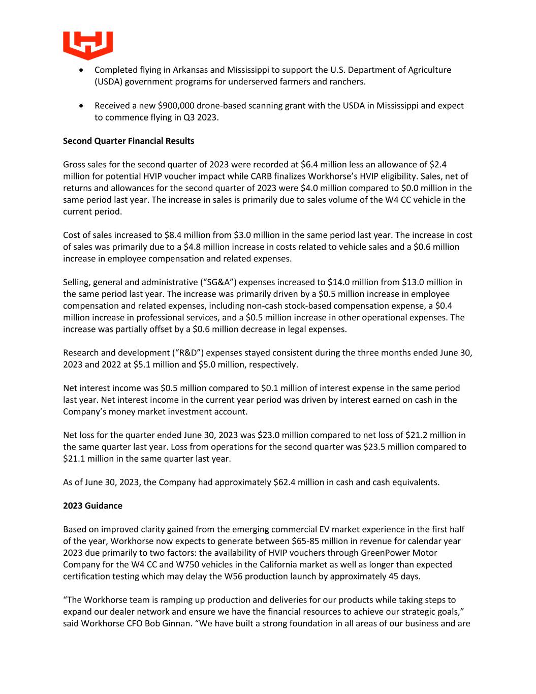 • Completed flying in Arkansas and Mississippi to support the U.S. Department of Agriculture (USDA) government programs for underserved farmers and ranchers. • Received a new $900,000 drone-based scanning grant with the USDA in Mississippi and expect to commence flying in Q3 2023. Second Quarter Financial Results Gross sales for the second quarter of 2023 were recorded at $6.4 million less an allowance of $2.4 million for potential HVIP voucher impact while CARB finalizes Workhorse’s HVIP eligibility. Sales, net of returns and allowances for the second quarter of 2023 were $4.0 million compared to $0.0 million in the same period last year. The increase in sales is primarily due to sales volume of the W4 CC vehicle in the current period. Cost of sales increased to $8.4 million from $3.0 million in the same period last year. The increase in cost of sales was primarily due to a $4.8 million increase in costs related to vehicle sales and a $0.6 million increase in employee compensation and related expenses. Selling, general and administrative (“SG&A”) expenses increased to $14.0 million from $13.0 million in the same period last year. The increase was primarily driven by a $0.5 million increase in employee compensation and related expenses, including non-cash stock-based compensation expense, a $0.4 million increase in professional services, and a $0.5 million increase in other operational expenses. The increase was partially offset by a $0.6 million decrease in legal expenses. Research and development (“R&D”) expenses stayed consistent during the three months ended June 30, 2023 and 2022 at $5.1 million and $5.0 million, respectively. Net interest income was $0.5 million compared to $0.1 million of interest expense in the same period last year. Net interest income in the current year period was driven by interest earned on cash in the Company’s money market investment account. Net loss for the quarter ended June 30, 2023 was $23.0 million compared to net loss of $21.2 million in the same quarter last year. Loss from operations for the second quarter was $23.5 million compared to $21.1 million in the same quarter last year. As of June 30, 2023, the Company had approximately $62.4 million in cash and cash equivalents. 2023 Guidance Based on improved clarity gained from the emerging commercial EV market experience in the first half of the year, Workhorse now expects to generate between $65-85 million in revenue for calendar year 2023 due primarily to two factors: the availability of HVIP vouchers through GreenPower Motor Company for the W4 CC and W750 vehicles in the California market as well as longer than expected certification testing which may delay the W56 production launch by approximately 45 days. “The Workhorse team is ramping up production and deliveries for our products while taking steps to expand our dealer network and ensure we have the financial resources to achieve our strategic goals,” said Workhorse CFO Bob Ginnan. “We have built a strong foundation in all areas of our business and are