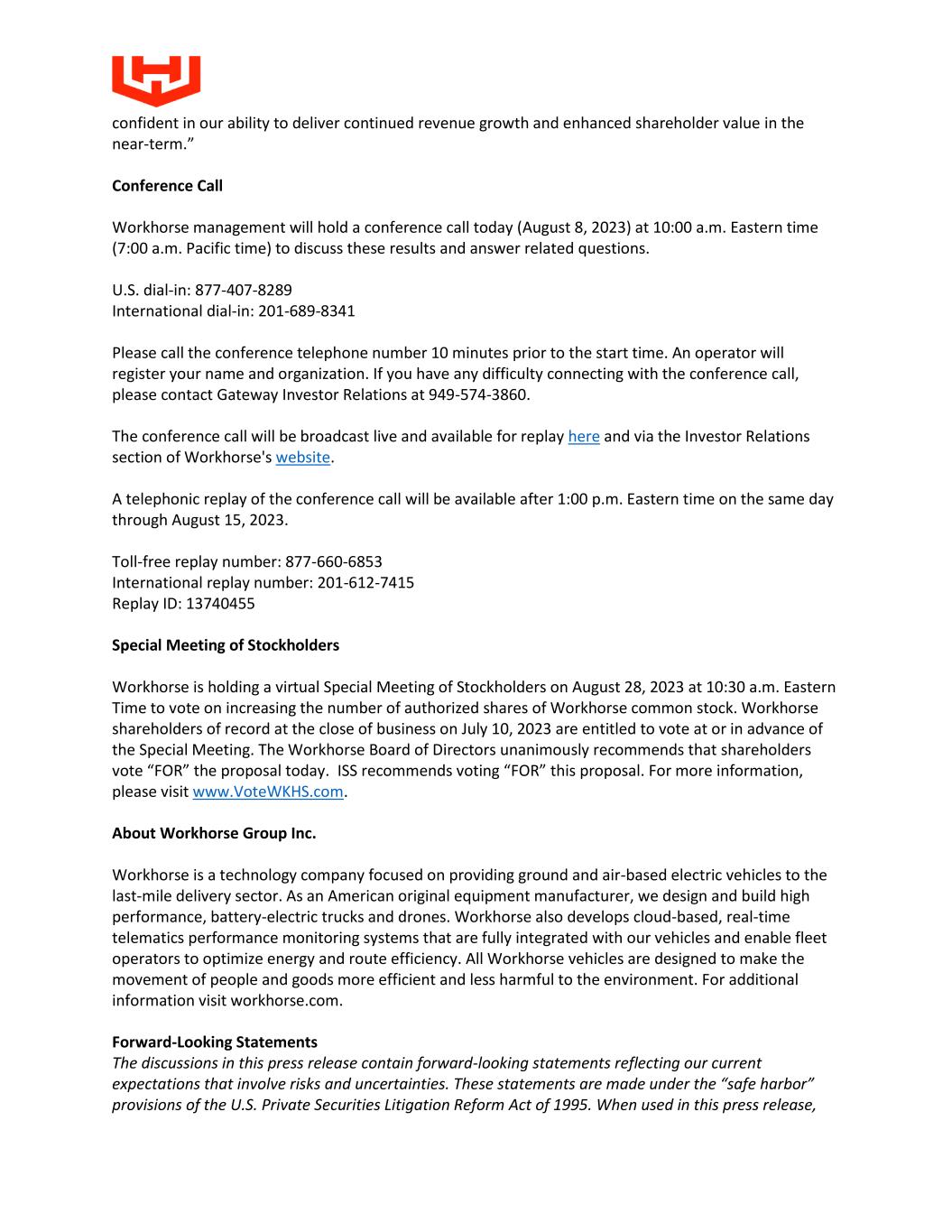 confident in our ability to deliver continued revenue growth and enhanced shareholder value in the near-term.” Conference Call Workhorse management will hold a conference call today (August 8, 2023) at 10:00 a.m. Eastern time (7:00 a.m. Pacific time) to discuss these results and answer related questions. U.S. dial-in: 877-407-8289 International dial-in: 201-689-8341 Please call the conference telephone number 10 minutes prior to the start time. An operator will register your name and organization. If you have any difficulty connecting with the conference call, please contact Gateway Investor Relations at 949-574-3860. The conference call will be broadcast live and available for replay here and via the Investor Relations section of Workhorse's website. A telephonic replay of the conference call will be available after 1:00 p.m. Eastern time on the same day through August 15, 2023. Toll-free replay number: 877-660-6853 International replay number: 201-612-7415 Replay ID: 13740455 Special Meeting of Stockholders Workhorse is holding a virtual Special Meeting of Stockholders on August 28, 2023 at 10:30 a.m. Eastern Time to vote on increasing the number of authorized shares of Workhorse common stock. Workhorse shareholders of record at the close of business on July 10, 2023 are entitled to vote at or in advance of the Special Meeting. The Workhorse Board of Directors unanimously recommends that shareholders vote “FOR” the proposal today. ISS recommends voting “FOR” this proposal. For more information, please visit www.VoteWKHS.com. About Workhorse Group Inc. Workhorse is a technology company focused on providing ground and air-based electric vehicles to the last-mile delivery sector. As an American original equipment manufacturer, we design and build high performance, battery-electric trucks and drones. Workhorse also develops cloud-based, real-time telematics performance monitoring systems that are fully integrated with our vehicles and enable fleet operators to optimize energy and route efficiency. All Workhorse vehicles are designed to make the movement of people and goods more efficient and less harmful to the environment. For additional information visit workhorse.com. Forward-Looking Statements The discussions in this press release contain forward-looking statements reflecting our current expectations that involve risks and uncertainties. These statements are made under the “safe harbor” provisions of the U.S. Private Securities Litigation Reform Act of 1995. When used in this press release,