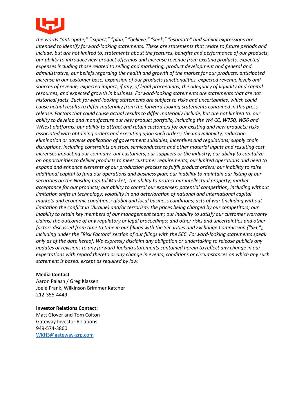 the words “anticipate,” “expect,” “plan,” “believe,” “seek,” “estimate” and similar expressions are intended to identify forward-looking statements. These are statements that relate to future periods and include, but are not limited to, statements about the features, benefits and performance of our products, our ability to introduce new product offerings and increase revenue from existing products, expected expenses including those related to selling and marketing, product development and general and administrative, our beliefs regarding the health and growth of the market for our products, anticipated increase in our customer base, expansion of our products functionalities, expected revenue levels and sources of revenue, expected impact, if any, of legal proceedings, the adequacy of liquidity and capital resources, and expected growth in business. Forward-looking statements are statements that are not historical facts. Such forward-looking statements are subject to risks and uncertainties, which could cause actual results to differ materially from the forward-looking statements contained in this press release. Factors that could cause actual results to differ materially include, but are not limited to: our ability to develop and manufacture our new product portfolio, including the W4 CC, W750, W56 and WNext platforms; our ability to attract and retain customers for our existing and new products; risks associated with obtaining orders and executing upon such orders; the unavailability, reduction, elimination or adverse application of government subsidies, incentives and regulations; supply chain disruptions, including constraints on steel, semiconductors and other material inputs and resulting cost increases impacting our company, our customers, our suppliers or the industry; our ability to capitalize on opportunities to deliver products to meet customer requirements; our limited operations and need to expand and enhance elements of our production process to fulfill product orders; our inability to raise additional capital to fund our operations and business plan; our inability to maintain our listing of our securities on the Nasdaq Capital Market; the ability to protect our intellectual property; market acceptance for our products; our ability to control our expenses; potential competition, including without limitation shifts in technology; volatility in and deterioration of national and international capital markets and economic conditions; global and local business conditions; acts of war (including without limitation the conflict in Ukraine) and/or terrorism; the prices being charged by our competitors; our inability to retain key members of our management team; our inability to satisfy our customer warranty claims; the outcome of any regulatory or legal proceedings; and other risks and uncertainties and other factors discussed from time to time in our filings with the Securities and Exchange Commission ("SEC"), including under the “Risk Factors” section of our filings with the SEC. Forward-looking statements speak only as of the date hereof. We expressly disclaim any obligation or undertaking to release publicly any updates or revisions to any forward-looking statements contained herein to reflect any change in our expectations with regard thereto or any change in events, conditions or circumstances on which any such statement is based, except as required by law. Media Contact Aaron Palash / Greg Klassen Joele Frank, Wilkinson Brimmer Katcher 212-355-4449 Investor Relations Contact: Matt Glover and Tom Colton Gateway Investor Relations 949-574-3860 [email protected]