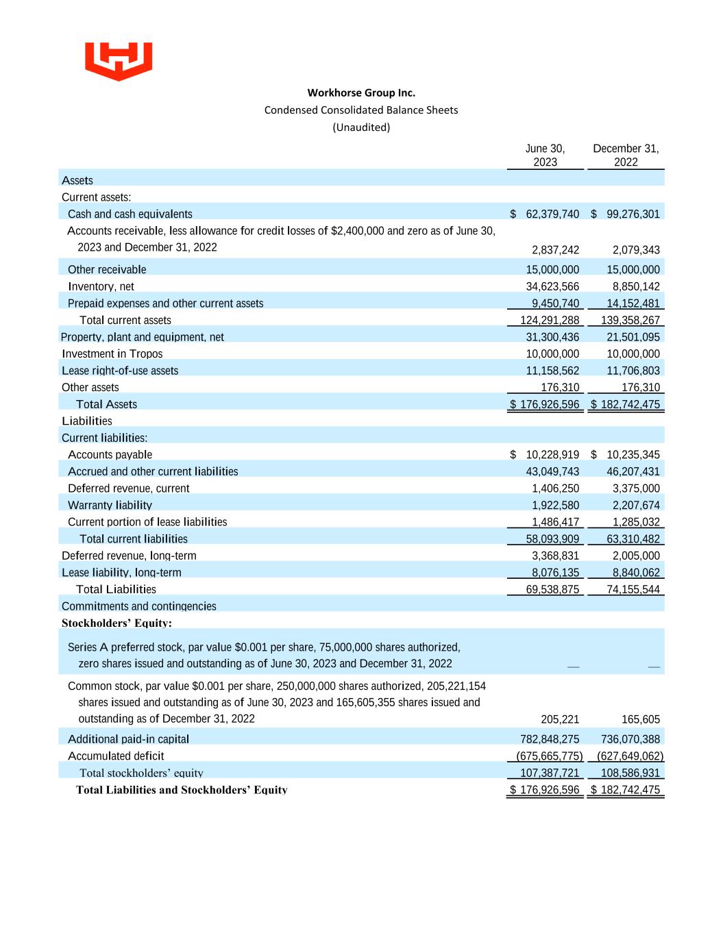 Workhorse Group Inc. Condensed Consolidated Balance Sheets (Unaudited) June 30, 2023 December 31, 2022 Assets Current assets: Cash and cash equivalents $ 62,379,740 $ 99,276,301 Accounts receivable, less allowance for credit losses of $2,400,000 and zero as of June 30, 2023 and December 31, 2022 2,837,242 2,079,343 Other receivable 15,000,000 15,000,000 Inventory, net 34,623,566 8,850,142 Prepaid expenses and other current assets 9,450,740 14,152,481 Total current assets 124,291,288 139,358,267 Property, plant and equipment, net 31,300,436 21,501,095 Investment in Tropos 10,000,000 10,000,000 Lease right-of-use assets 11,158,562 11,706,803 Other assets 176,310 176,310 Total Assets $ 176,926,596 $ 182,742,475 Liabilities Current liabilities: Accounts payable $ 10,228,919 $ 10,235,345 Accrued and other current liabilities 43,049,743 46,207,431 Deferred revenue, current 1,406,250 3,375,000 Warranty liability 1,922,580 2,207,674 Current portion of lease liabilities 1,486,417 1,285,032 Total current liabilities 58,093,909 63,310,482 Deferred revenue, long-term 3,368,831 2,005,000 Lease liability, long-term 8,076,135 8,840,062 Total Liabilities 69,538,875 74,155,544 Commitments and contingencies Stockholders’ Equity: Series A preferred stock, par value $0.001 per share, 75,000,000 shares authorized, zero shares issued and outstanding as of June 30, 2023 and December 31, 2022 — — Common stock, par value $0.001 per share, 250,000,000 shares authorized, 205,221,154 shares issued and outstanding as of June 30, 2023 and 165,605,355 shares issued and outstanding as of December 31, 2022 205,221 165,605 Additional paid-in capital 782,848,275 736,070,388 Accumulated deficit (675,665,775) (627,649,062) Total stockholders’ equity 107,387,721 108,586,931 Total Liabilities and Stockholders’ Equity $ 176,926,596 $ 182,742,475